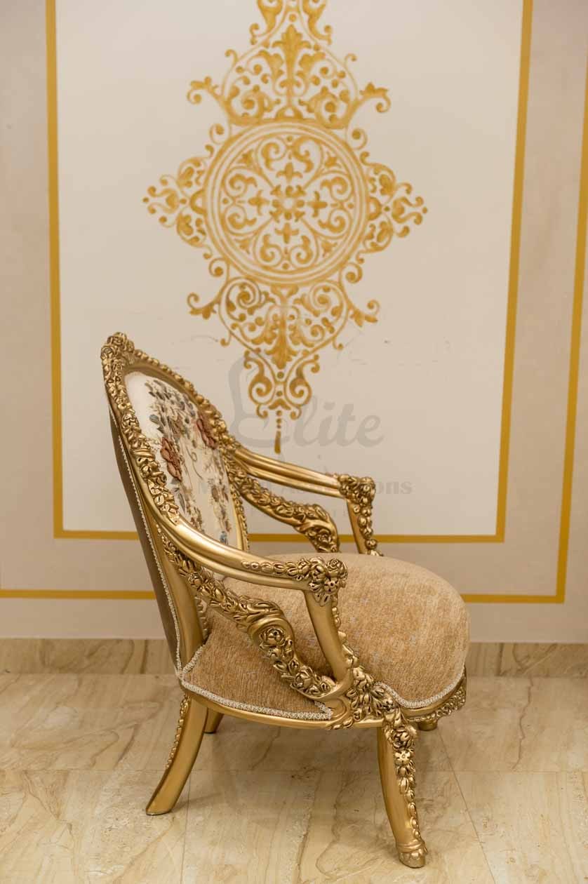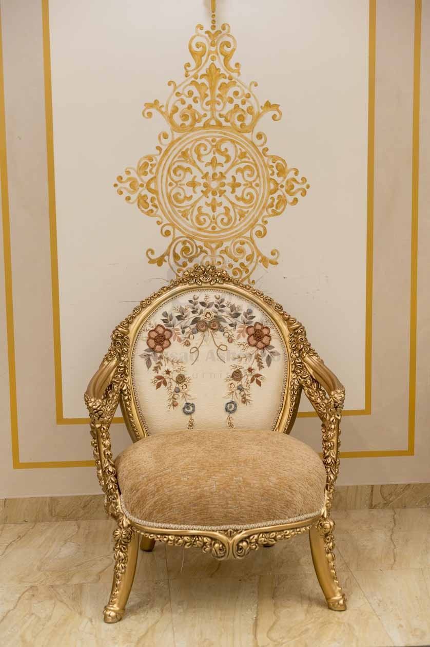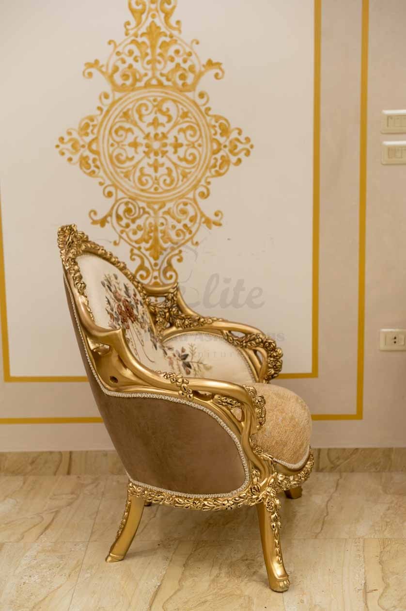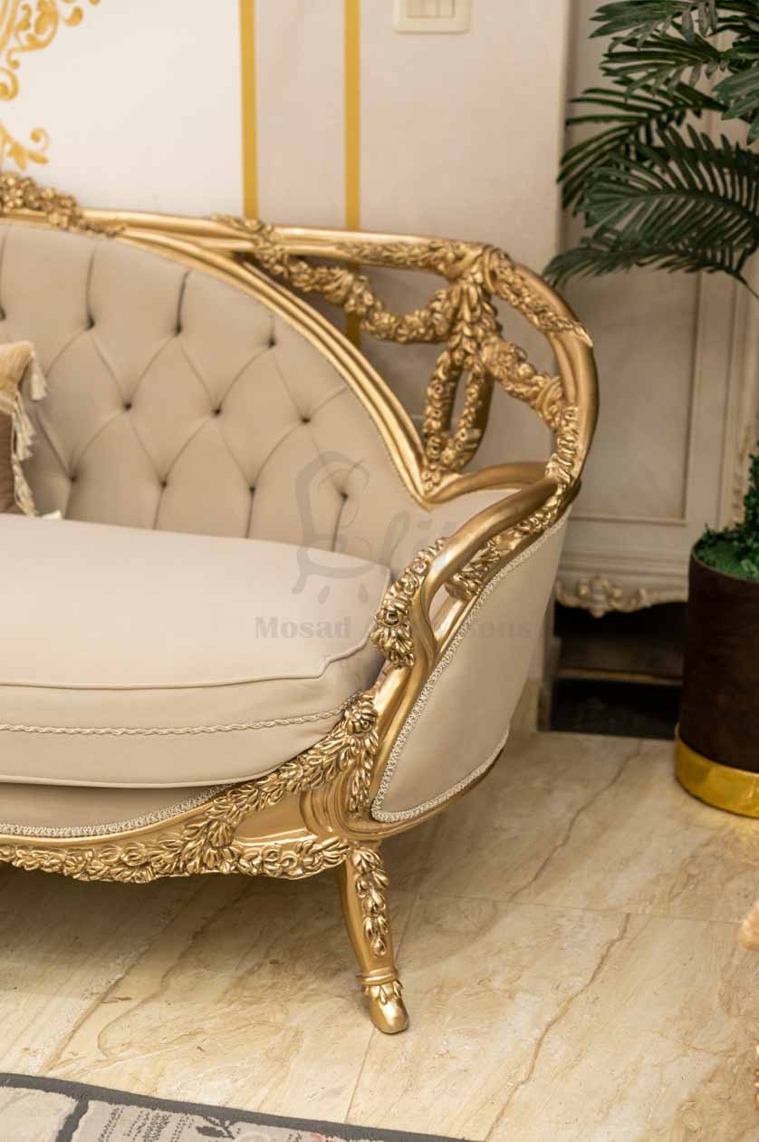 الهيكل الخارجي مصنوع من الخشب الطبيعي المطلي بلون ذهبي لامع، بنقوش دقيقة على الأذرع والساقين تضيف فخامة للتصميم. التنجيد الفاخر بلون هادئ يعزز الإحساس بالدفء والرقي، بينما تمنح الوسائد المطرزة لمسة ناعمة من الفخامة الحديثة.