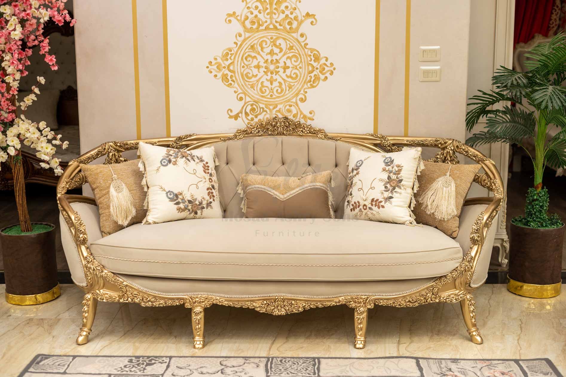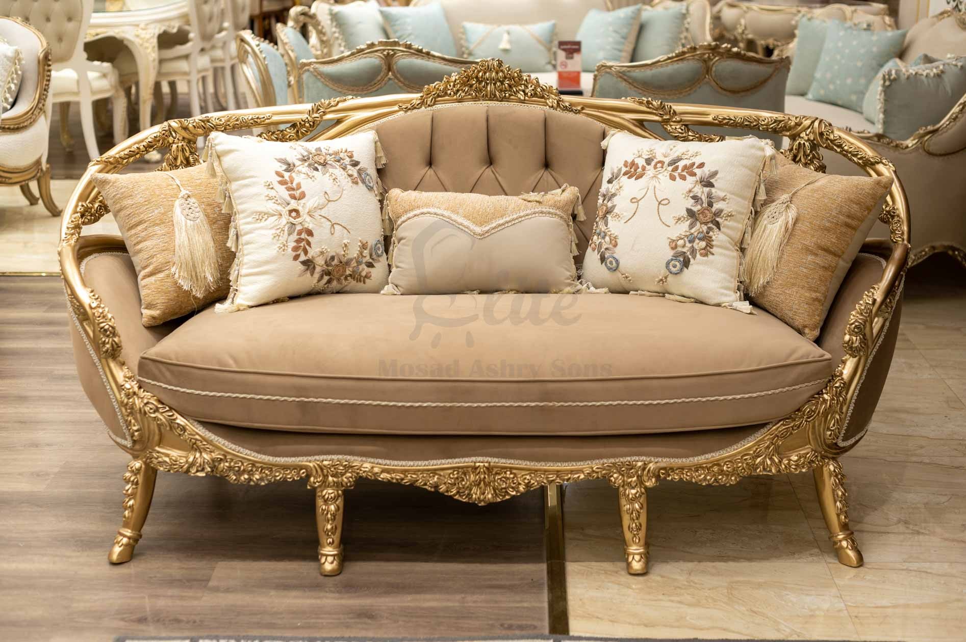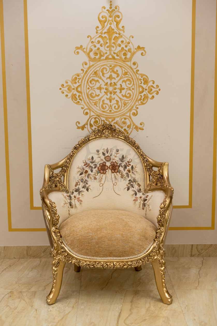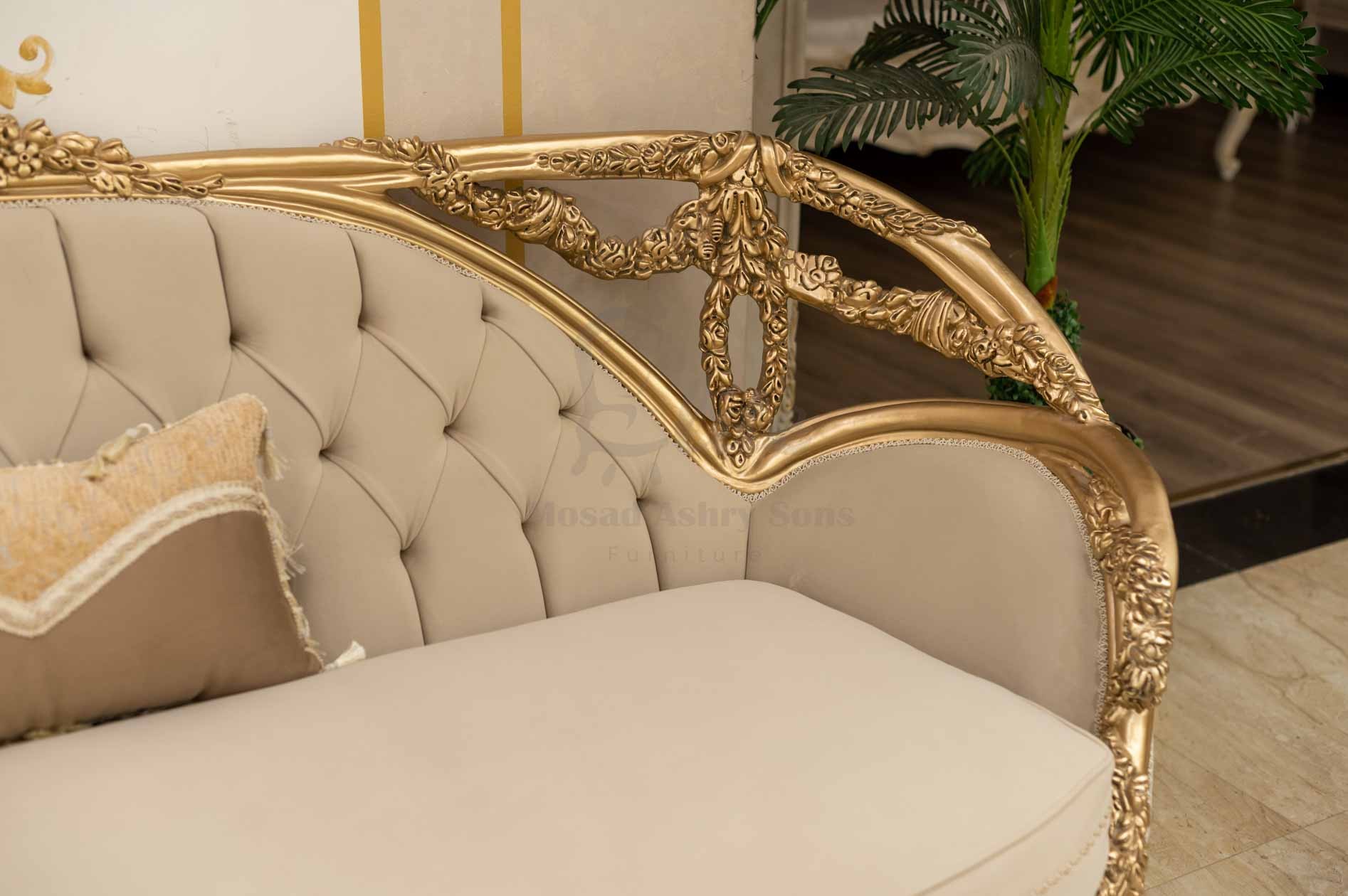 الهيكل الخارجي مصنوع من الخشب الطبيعي المطلي بلون ذهبي لامع، بنقوش دقيقة على الأذرع والساقين تضيف فخامة للتصميم. التنجيد الفاخر بلون هادئ يعزز الإحساس بالدفء والرقي، بينما تمنح الوسائد المطرزة لمسة ناعمة من الفخامة الحديثة.