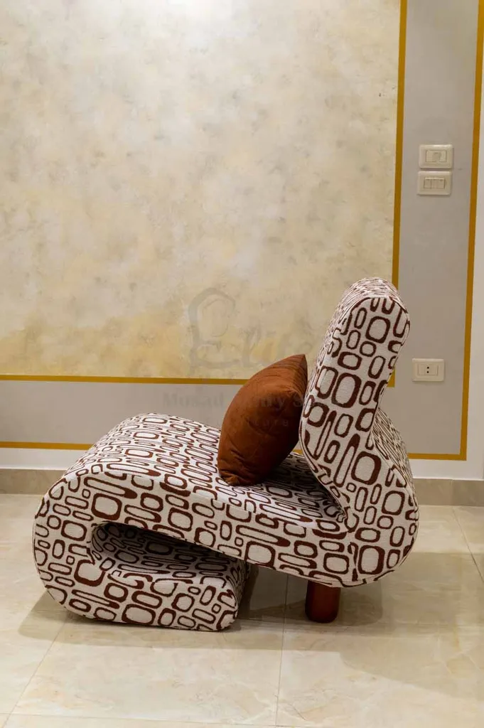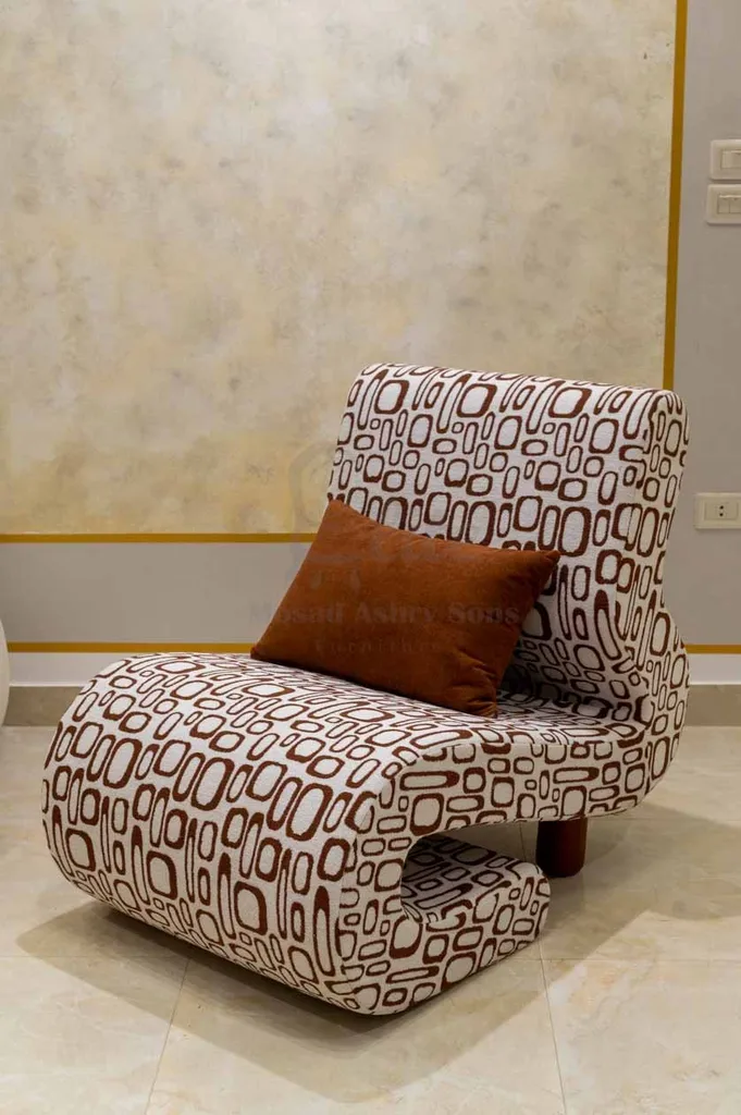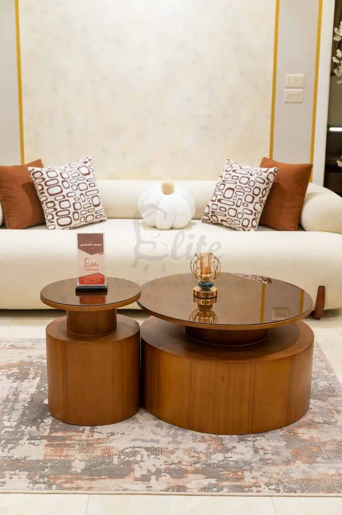 أما الفوتيهان فبتصميم هندسي مبتكر يعكس روح الجرأة في الطراز المودرن، مع مقاعد مريحة تمنح إحساسًا بالاسترخاء الكامل. في المنتصف، تأتي ترابيزة القهوة بتصميم مزدوج دائري من الخشب الطبيعي، تضيف لمسة دفء وانسجام للمساحة.