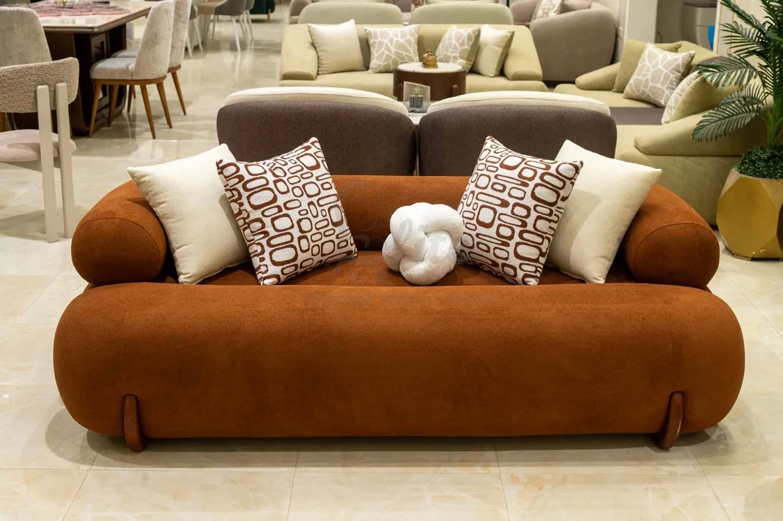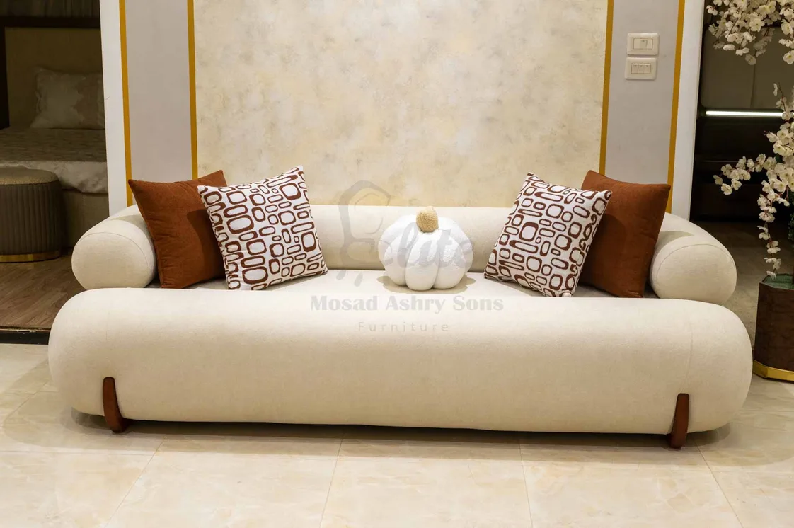 الكنبتان تتميزان بتصميم انسيابي بأذرع دائرية وحواف ناعمة، تضيف لمسة دفء ومرونة للتكوين العام. التنجيد يأتي بخامات فاخرة تجمع بين النعومة والمتانة، مع وسائد زخرفية منقوشة تضفي حيوية وتباينًا جذابًا في الألوان.