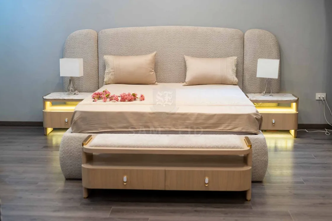 السرير بهيكل مبطن بالكامل ورأسية مرتفعة بخطوط ناعمة تعكس البساطة والأناقة.