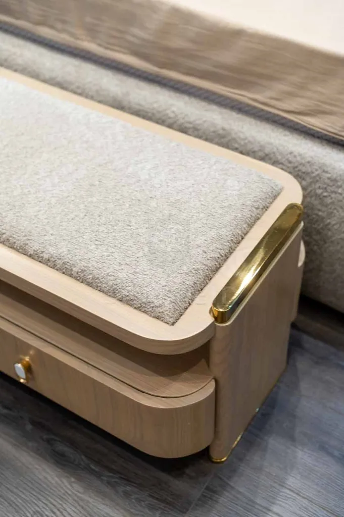 أمام السرير بانكيت منجد بالكامل مع قاعدة خشبية ولمسات ذهبية ودرجين مدمجين.