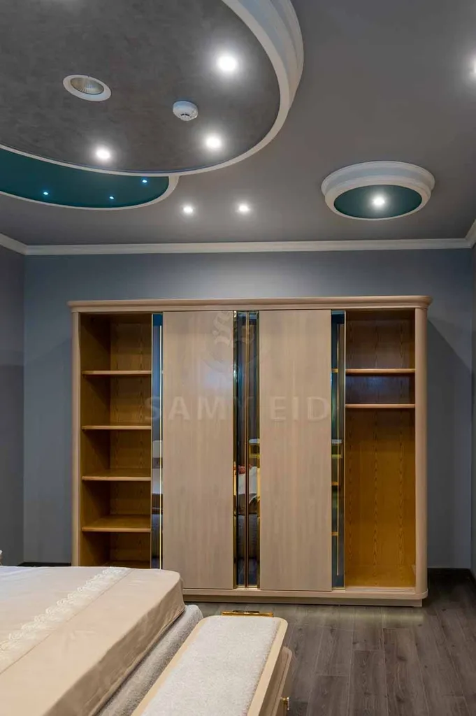 الدولاب بأبواب منزلقة كبيرة، يتوسطه بابان زجاجيان بإطارات ذهبية تعكس الضوء وتوفر سعة تخزين واسعة.