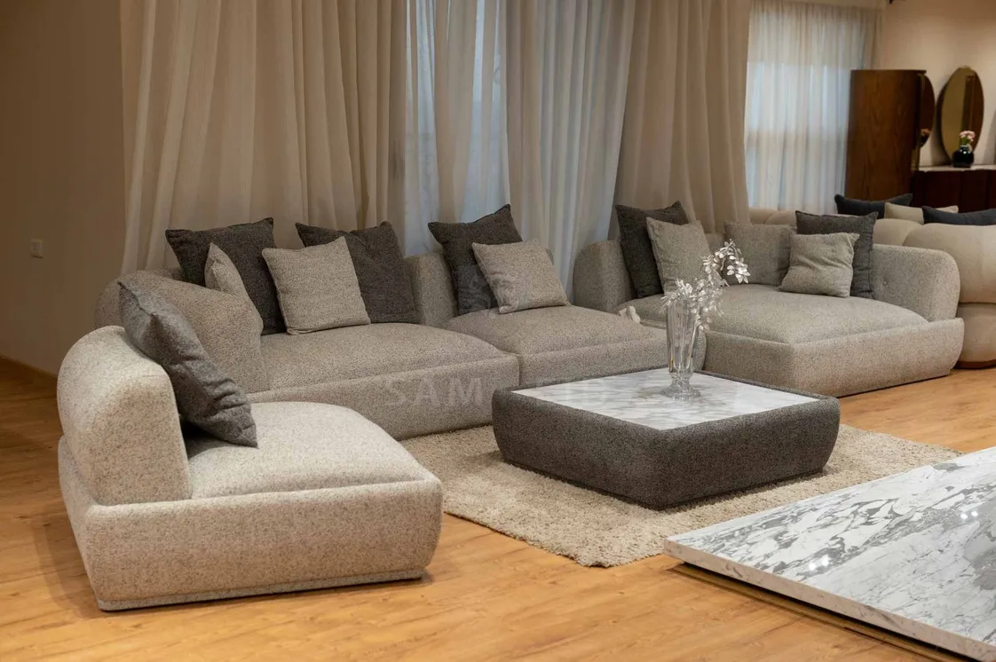 • الكنبة الزاوية الكبيرة: بلون رمادي فاتح، خطوط ناعمة ومنحنية تمنح شعورًا بالاتساع والراحة، مع وحدات متعددة ووسائد بدرجات الرمادي الداكن والفاتح لتدرج لوني أنيق.