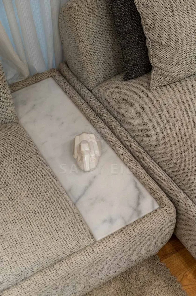 • طاولة القهوة المربعة: قاعدة رمادية مبطنة وسطح رخامي أبيض، تضيف لمسة فاخرة وتكسر حيادية الألوان، موازنة بين العملية والجمالية.