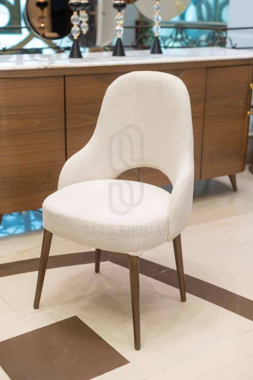 طاولة طعام مستطيلة مصنوعة من أجود أنواع الخشب، مع سطح زجاجي شفاف يضيف لمسة عصرية وأنيقة لغرفة الطعام. تحيط بها كراسي مبطنة بقماش مخملي ناعم بلون فاتح، بتصميم مريح ومسند ظهر داعم، وأرجل خشبية متناسقة مع قاعدة الطاولة، مما يخلق تناغمًا راقيًا ومريحًا.