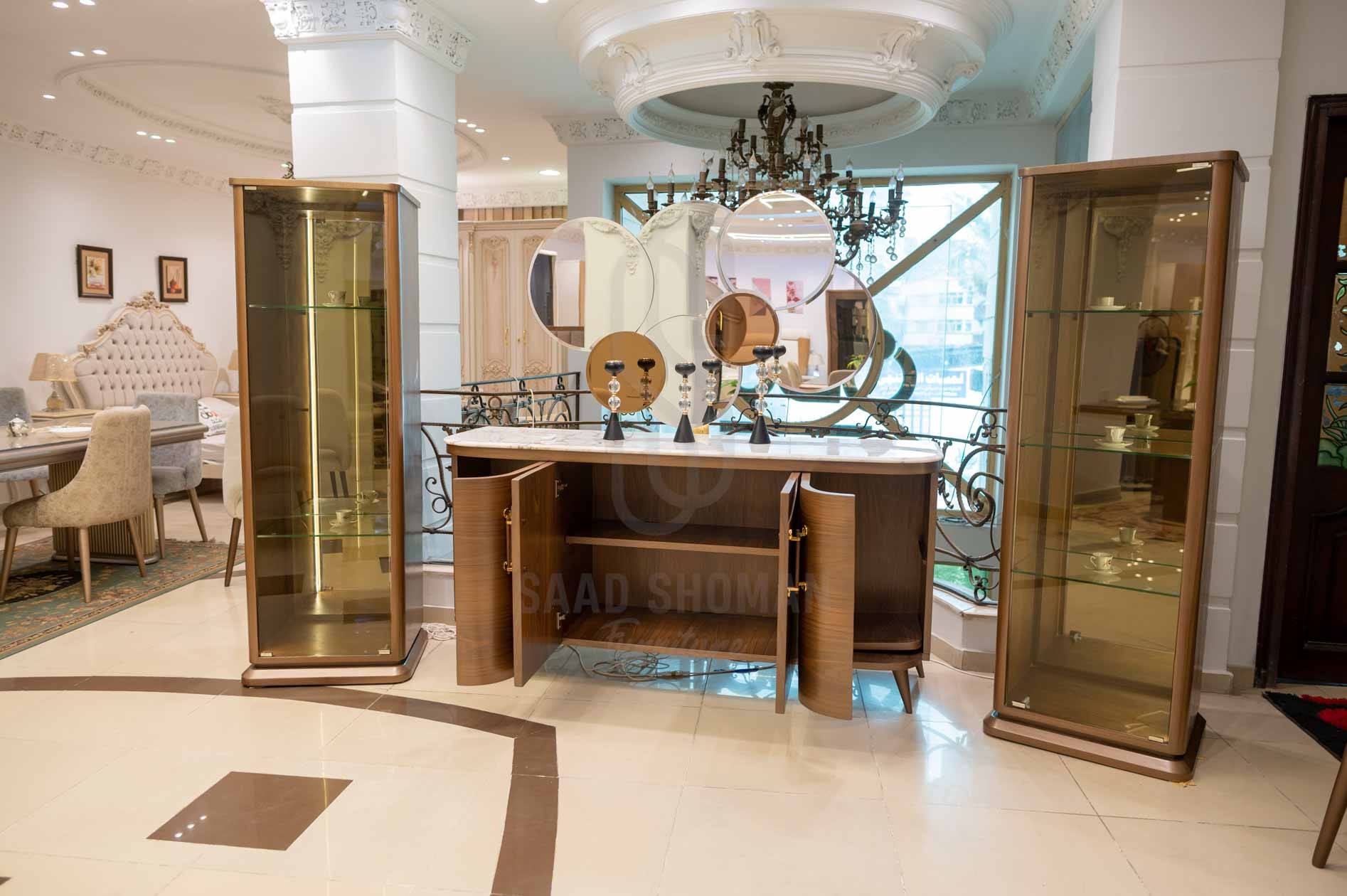 البوفيه الخشبي الراقي يأتي بسطح رخامي فاخر، مزود بأربع أبواب أنيقة مع مقابض ذهبية تضفي فخامة وذوقاً رفيعاً. يعلوه برواز مميز يحتوي على مجموعة من المرايا الدائرية بأحجام متفاوتة مرتبة بفن متقن. جانبي البوفيه يحتويان على وحدات بواجهات زجاجية مع أرفف شفافة لعرض الأواني والأدوات، مما يزيد من الوظيفة والجمال في التصميم.