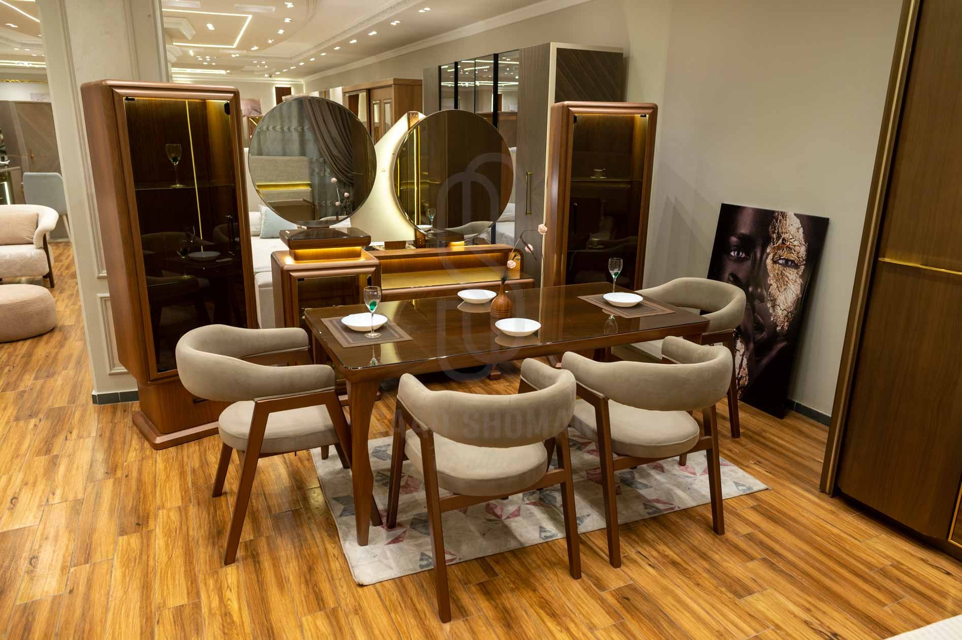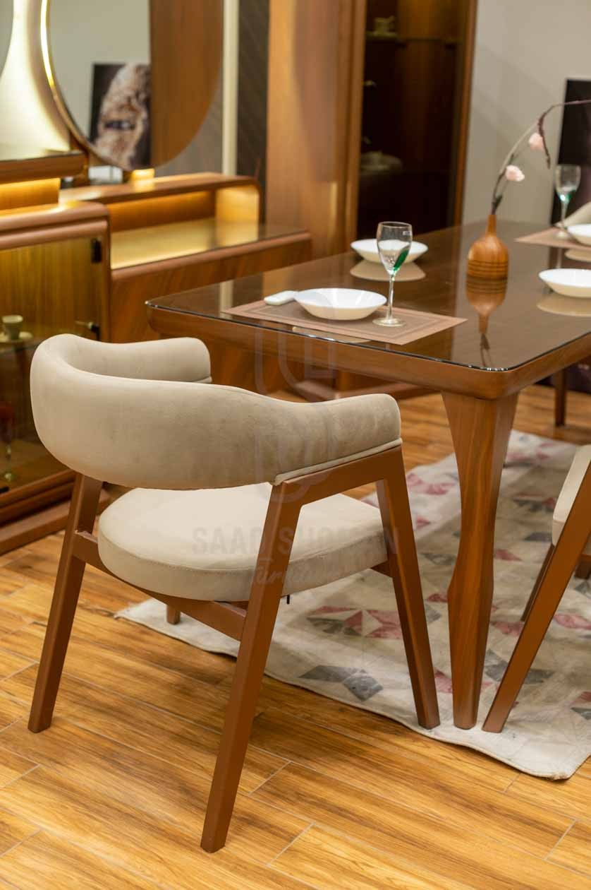 ترابيزة السفرة: مستطيلة من الخشب الطبيعي بلون بني متوسط، بسطح زجاجي شفاف وأرجل مستقيمة متينة تمنح ثباتًا وانسجامًا.