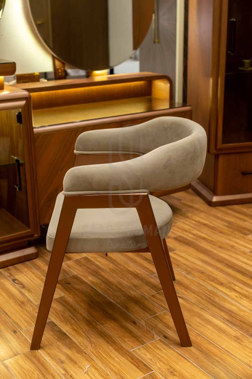 الكراسي: عدد 6 كراسي مريحة بهيكل خشبي متناسق مع الترابيزة، مقعد وظهر مبطنان بقماش ناعم بلون بيج فاتح مائل للرمادي، ظهر متوسط الارتفاع بانحناءة مريحة.