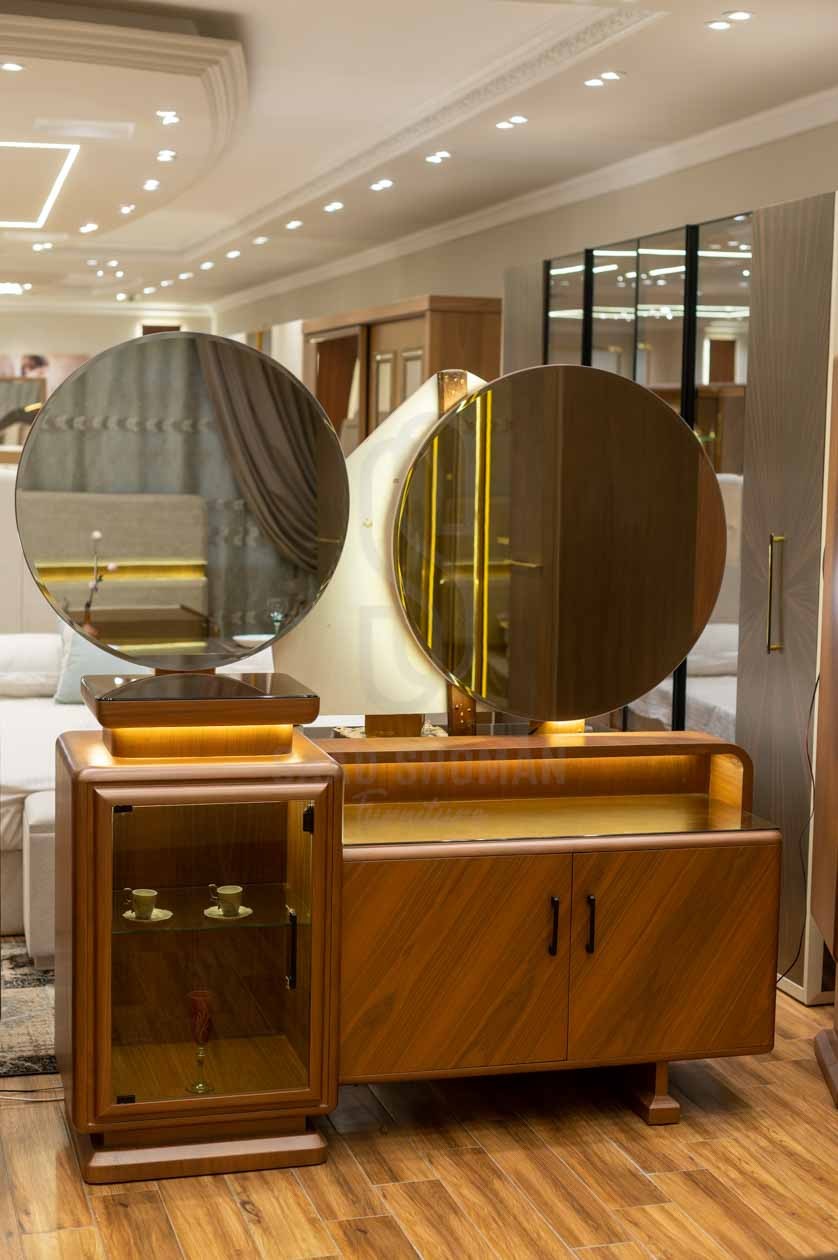 المرايا: مرآتان دائريتان متجاورتان بدون إطار فوق البوفيه، تضيفان اتساعًا وتوازنًا بصريًا.