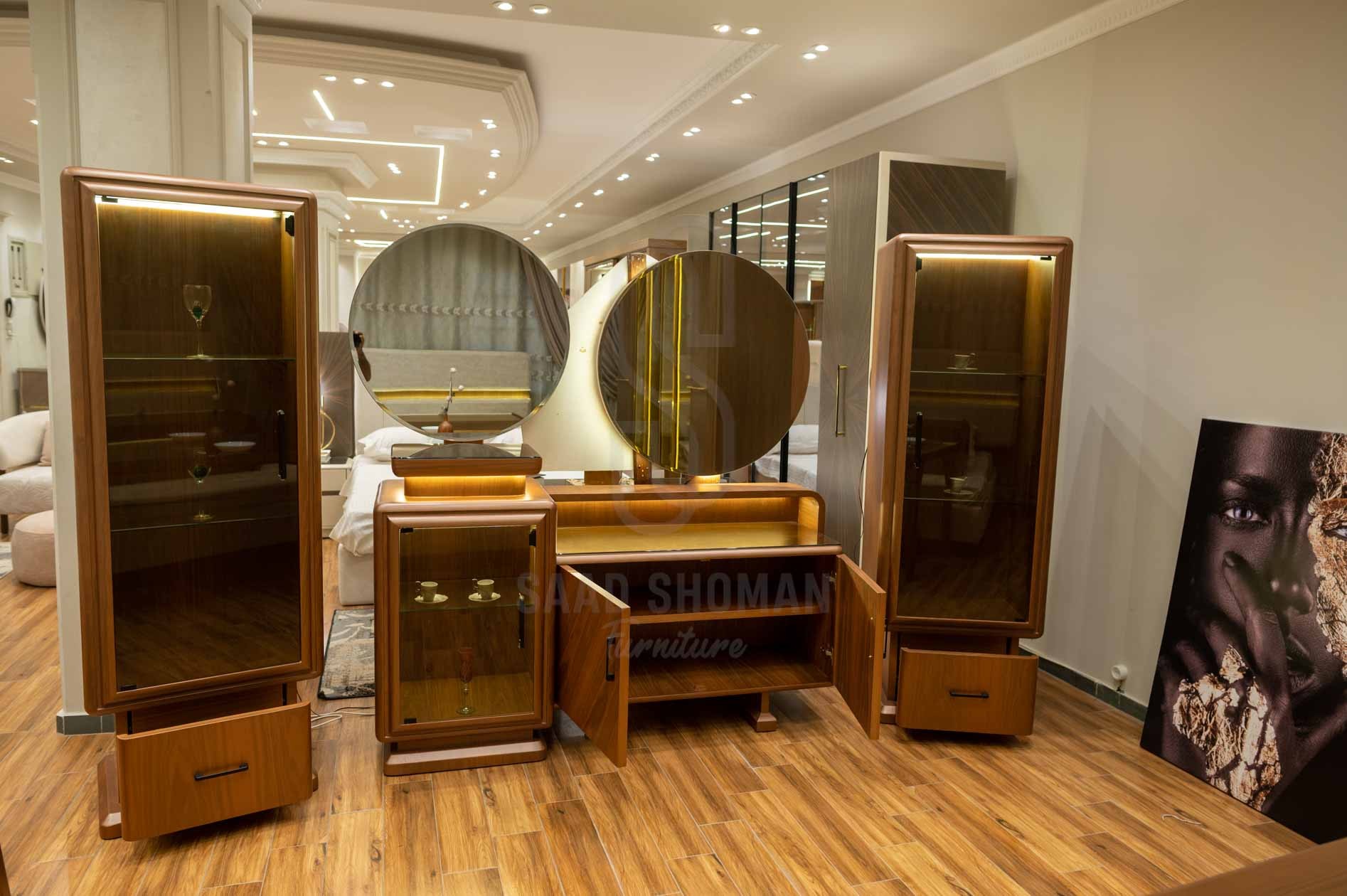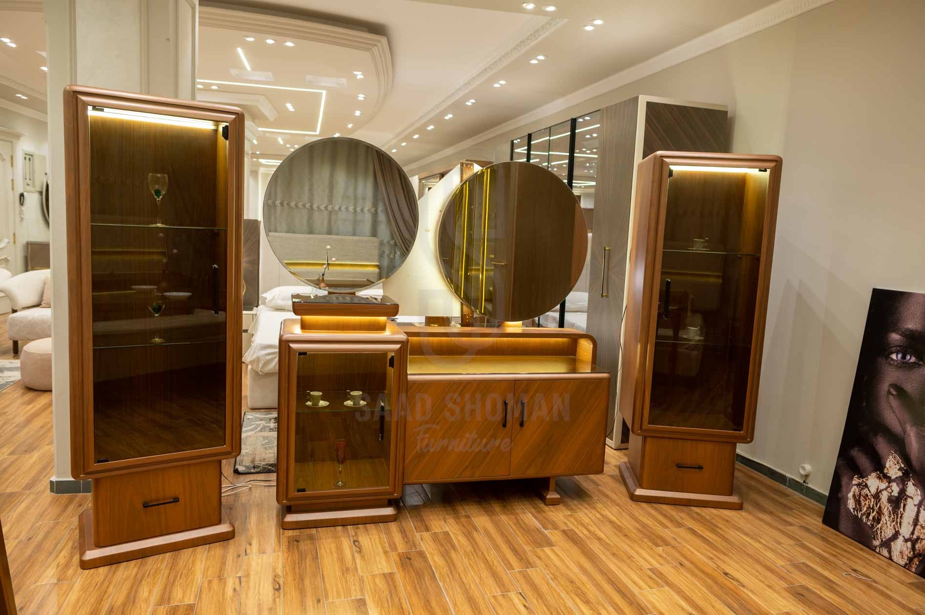 الخزانتان الجانبيتان: زوج من الوحدات الطويلة الخشبية بتشطيب لامع وأبواب زجاجية مع إضاءة داخلية ودرج سفلي، تكمل وحدة التخزين بشكل متكامل وفاخر.