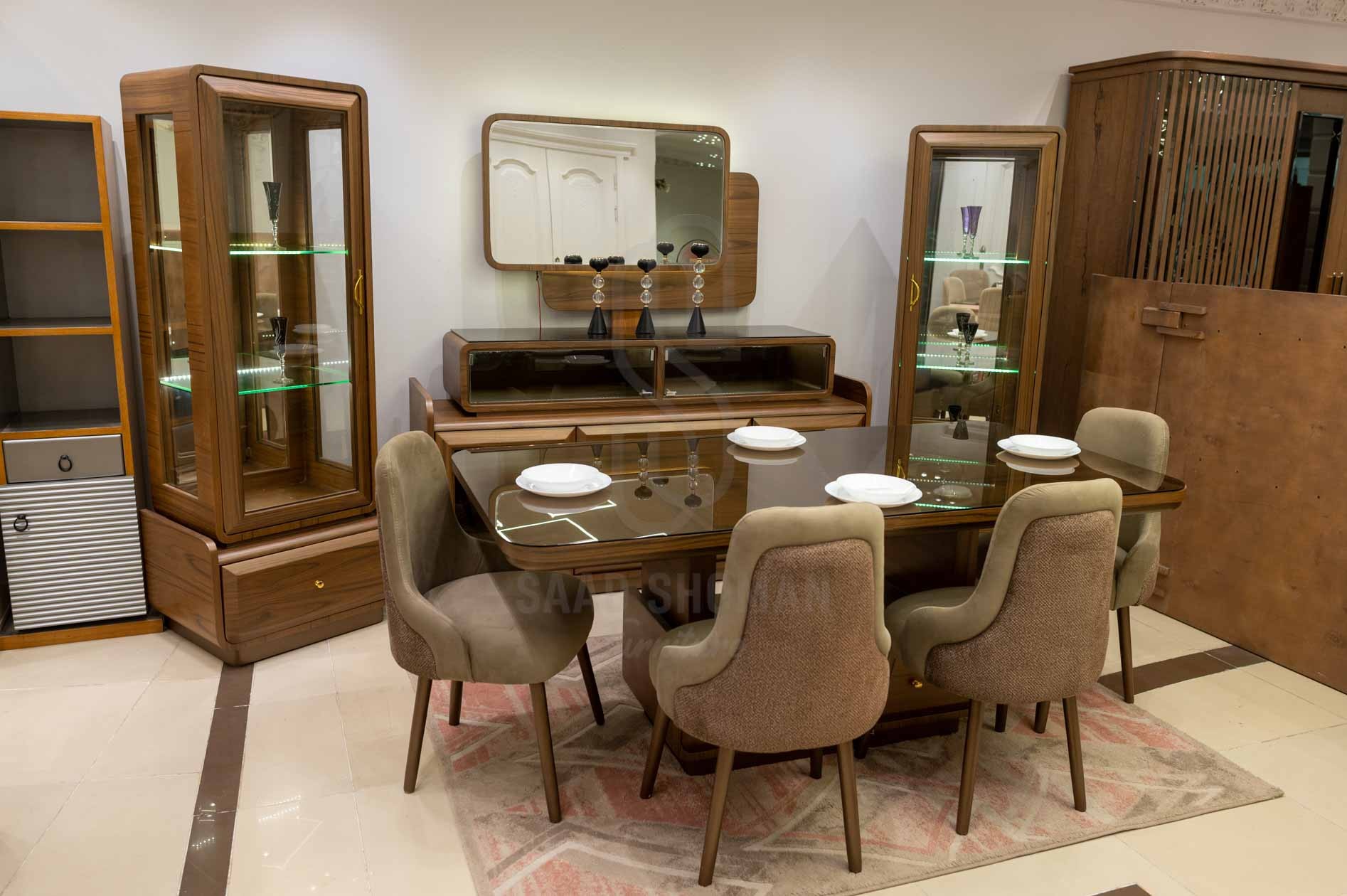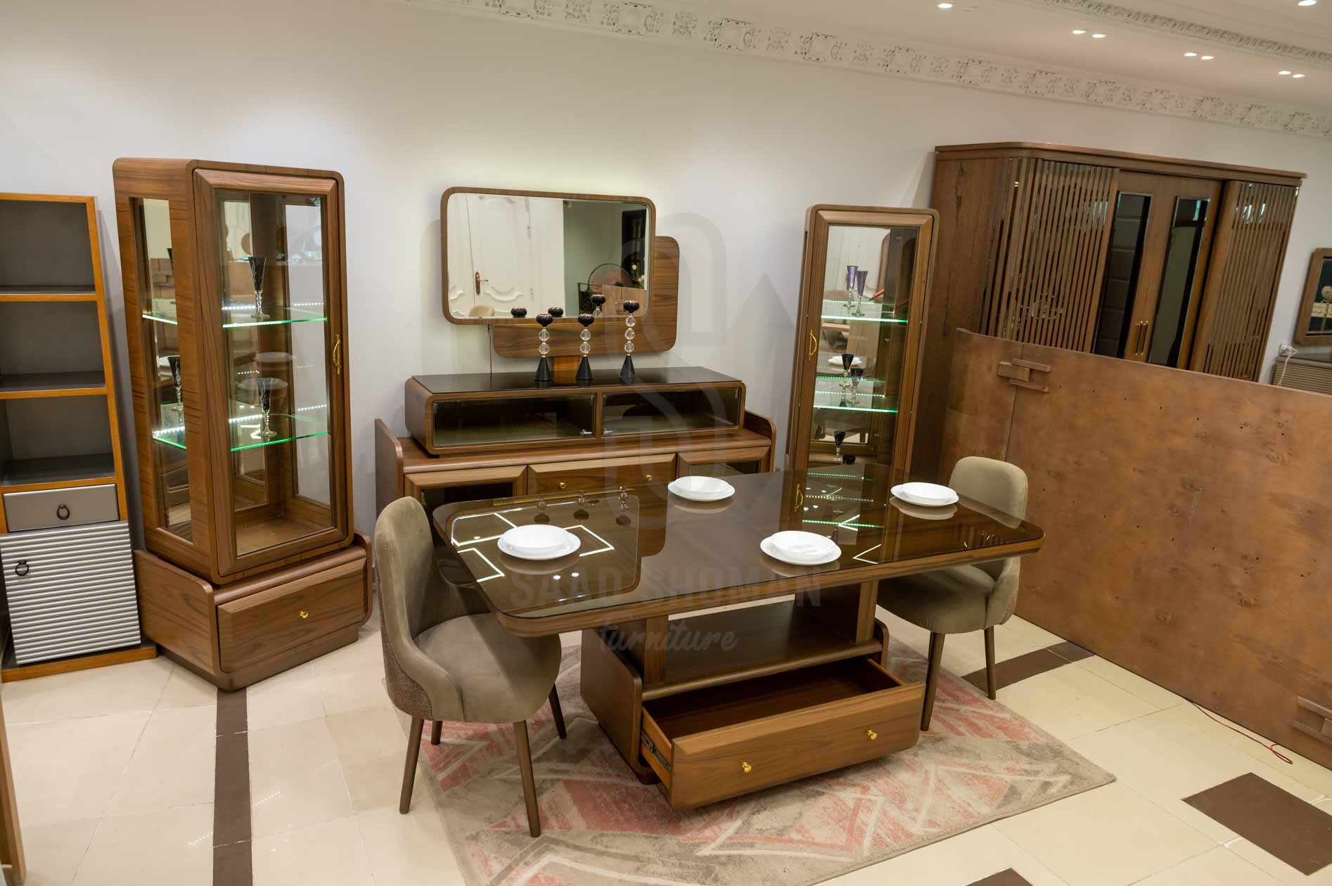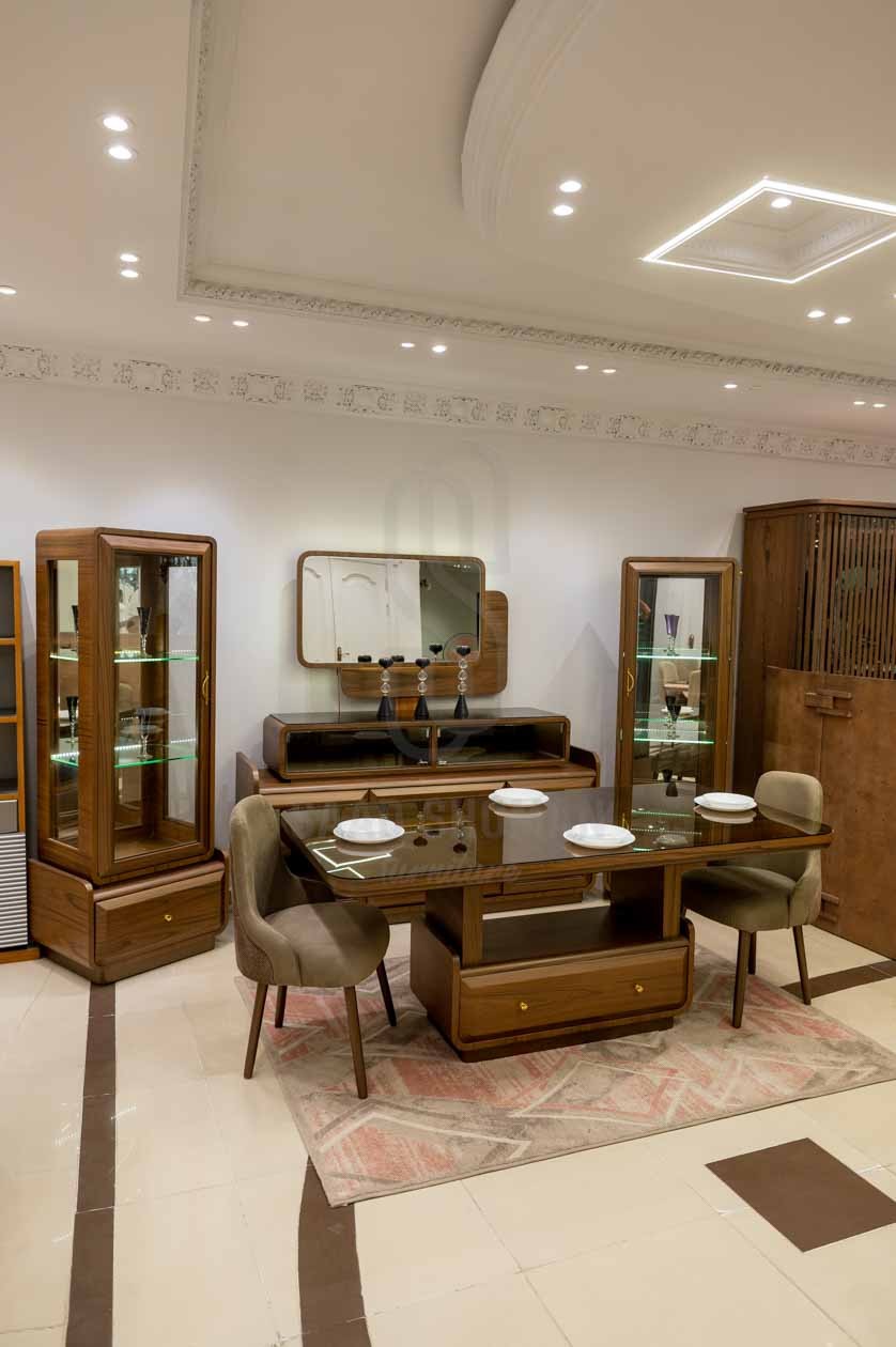 ترابيزة السفرة: مستطيلة بخطوط مستقيمة من الخشب الطبيعي بتشطيب لامع ولون بني متوسط، سطح زجاجي شفاف مع درج مدمج يضيف وظيفة تخزينية ذكية.