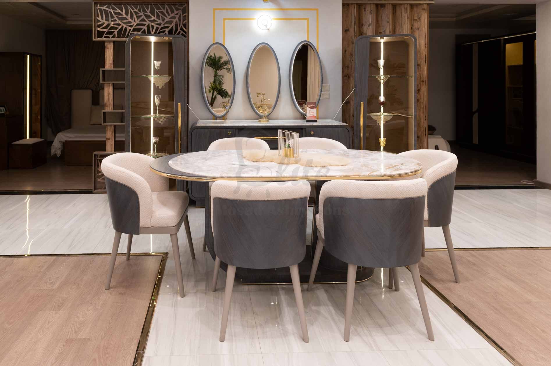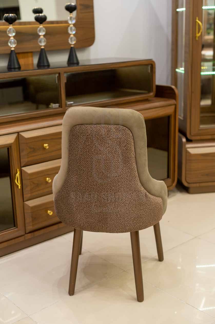 الكراسي: 6 كراسي خشبية بنفس لون الترابيزة، بمقاعد وظهور مبطنة بقماش ناعم بلون بيج مائل للرمادي. تصميمها العصري يوفر راحة ودعماً مميزاً للجلوس.
