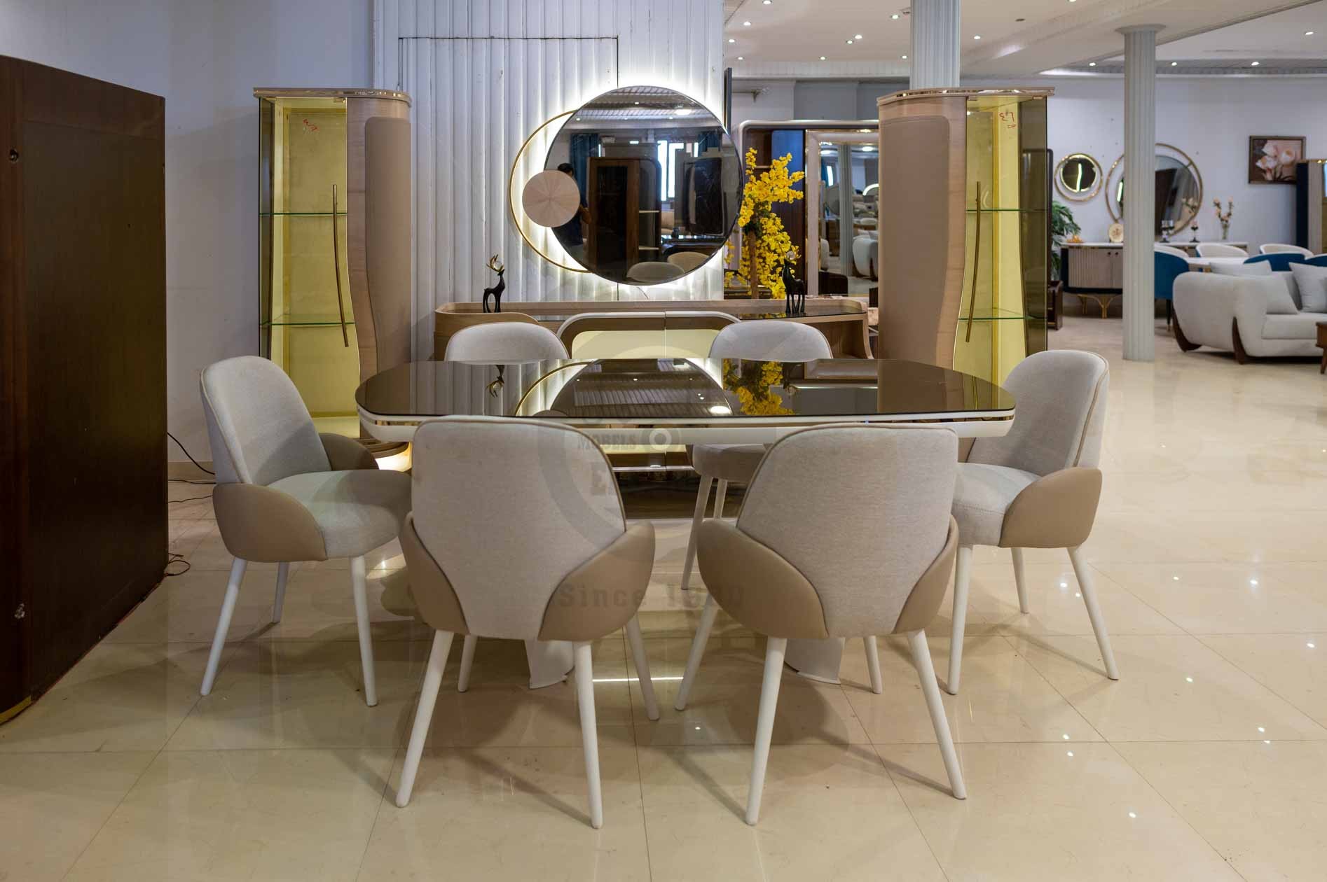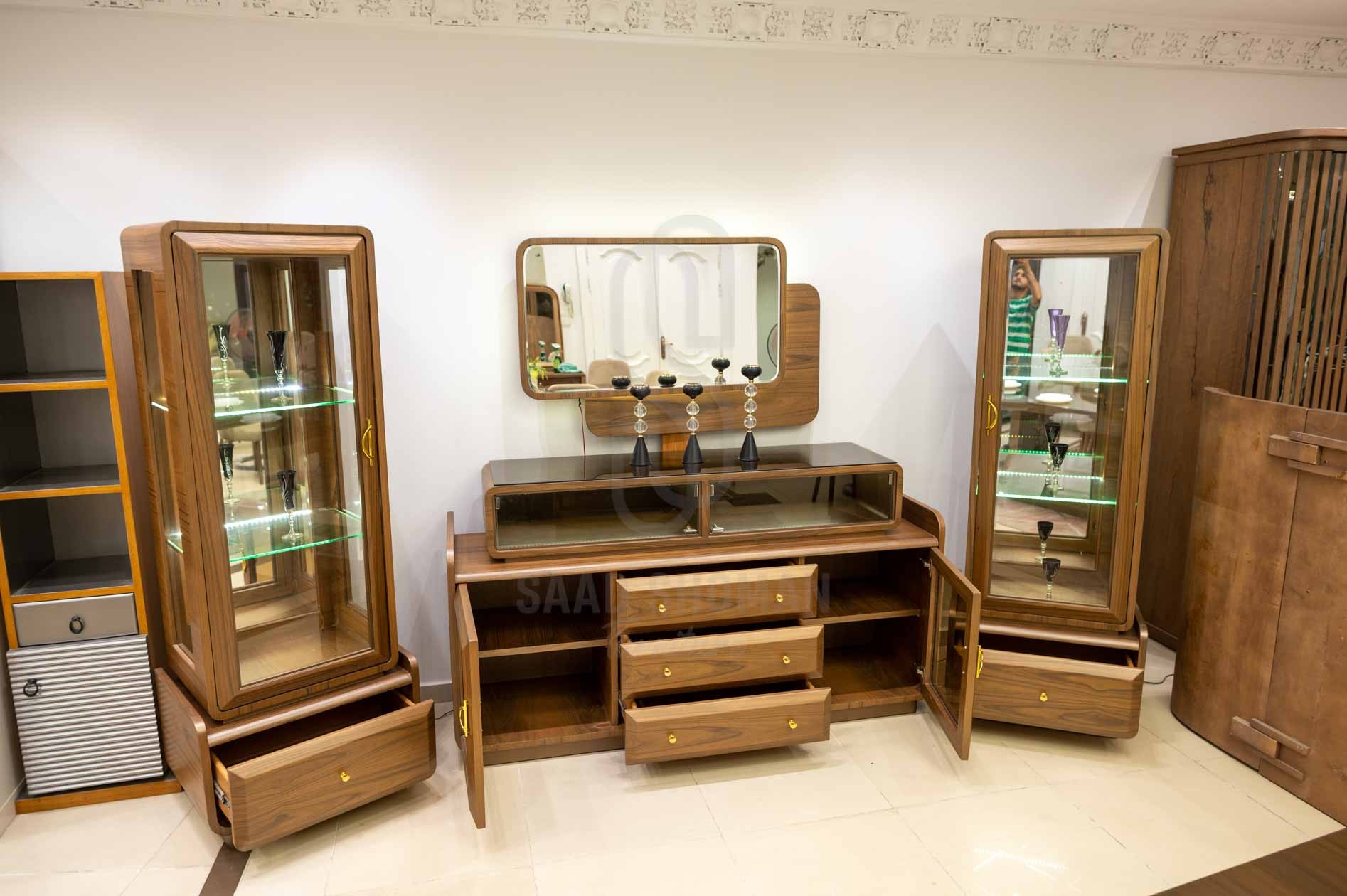 البوفيه: وحدة تخزين منخفضة بخطوط مستقيمة، مزودة بأدراج وأبواب مع سطح زجاجي علوي للعرض. المقابض الصغيرة الدائرية باللون الذهبي تضيف لمسة أنيقة.