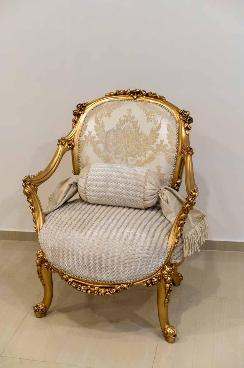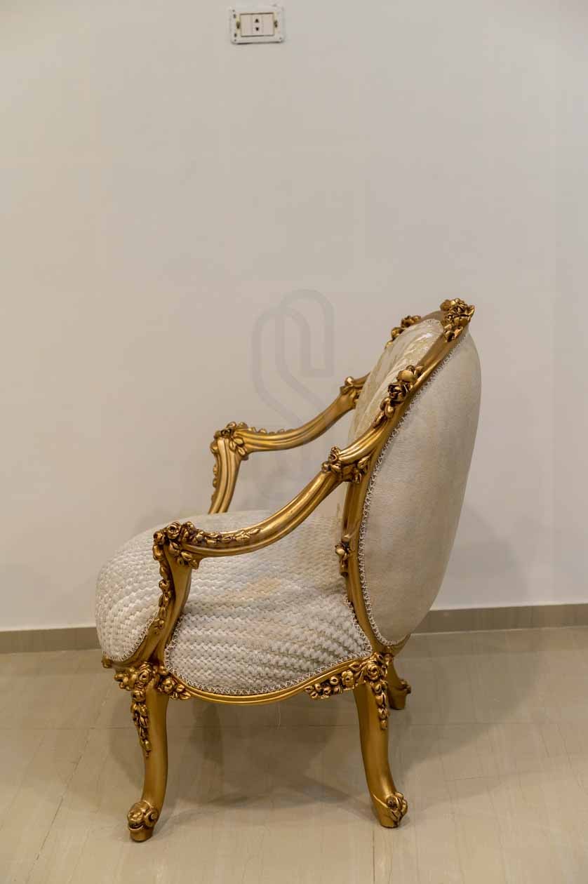 كنبة صالون كلاسيكية بتصميم فاخر يجمع بين الفخامة والراحة. الهيكل مصنوع من الخشب الطبيعي المطلي باللون الذهبي مع نقوش نباتية محفورة يدويًا تضفي طابعًا ملكيًا. الأذرع منحنية والساقان الأماميتان منحوتتان بشكل مزخرف بينما الخلفيتان مستقيمتان لثبات أكبر. الظهر مبطن بقماش كريمي مزخرف بنقشة داماسك أنيقة، والمقعد مكسو بقماش سادة مريح بنفس اللون، مما يمنح الكنبة توازنًا مثاليًا بين الأناقة العملية والرفاهية الكلاسيكية.