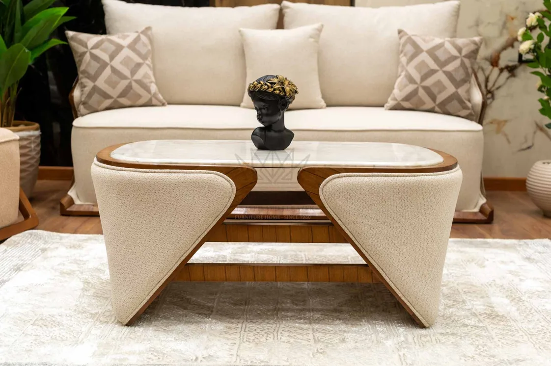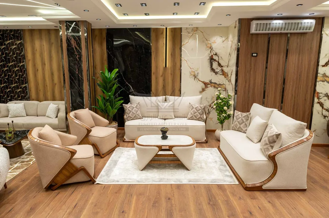 غرفة معيشة فاخرة مكونة من كنبة رئيسية، كنبة ثنائية، 2 فوتيه، وترابيزة قهوة بتصميم عصري أنيق.