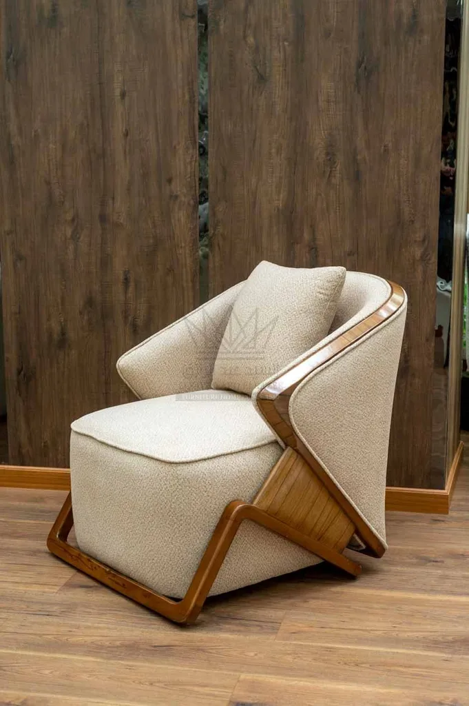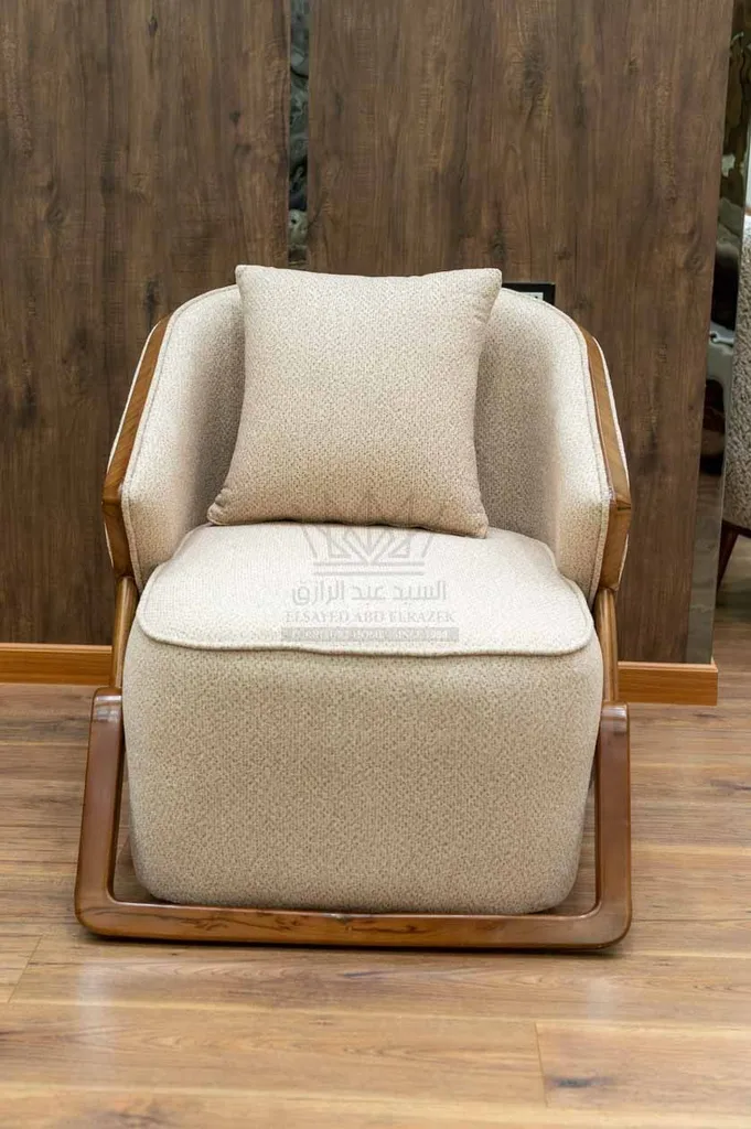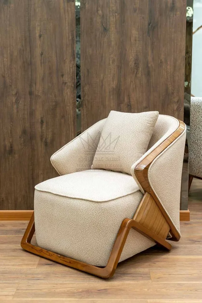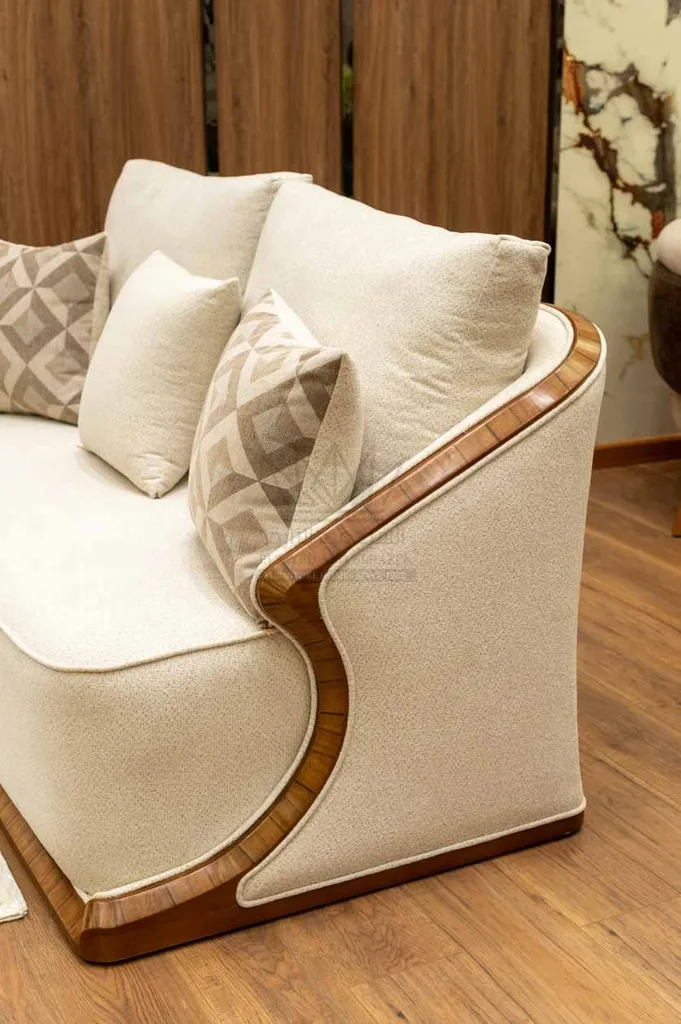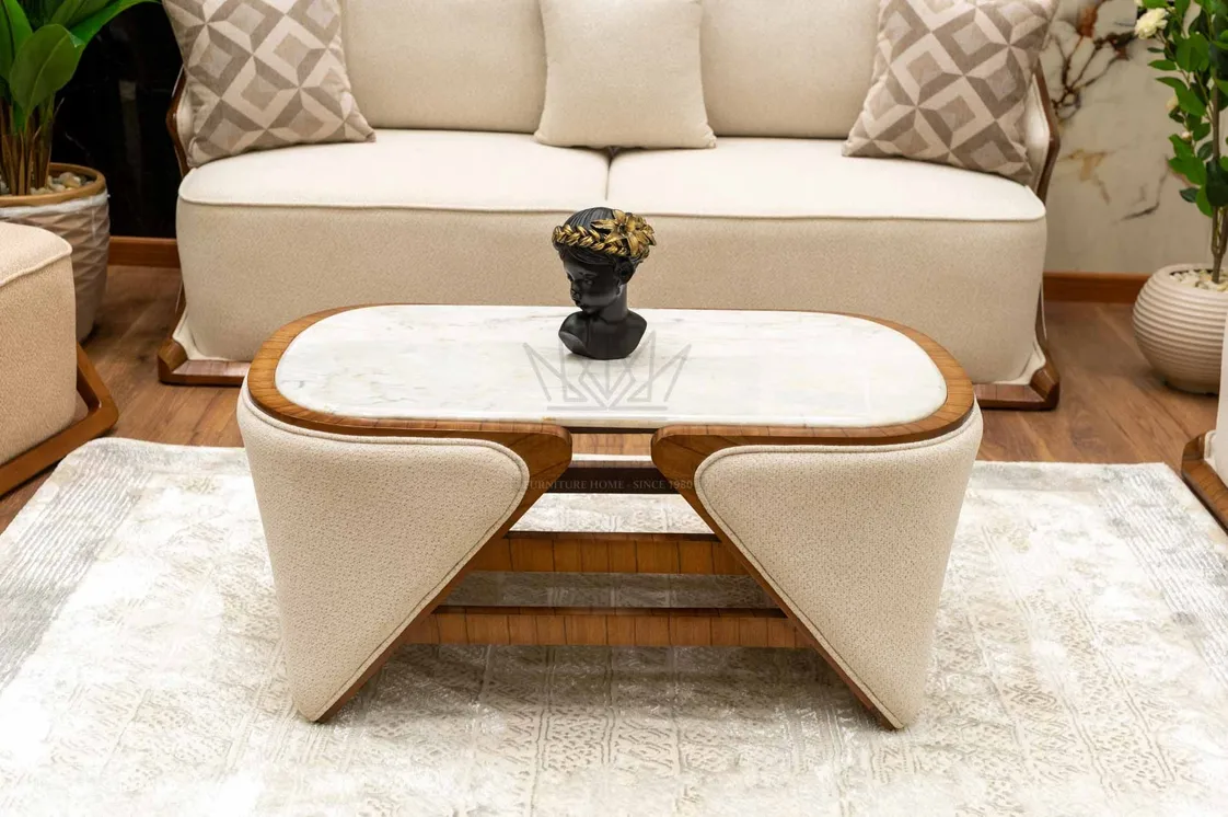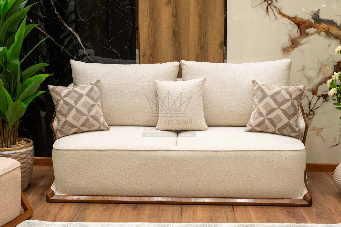 استمتع بالراحة والفخامة مع طقم جلوس متناسق بتصميم منحني مميز وتفاصيل خشبية أنيقة. تأتي الكنبة الرئيسية والكنبة الثنائية بمساند ظهر كبيرة ووسائد مريحة تضيف لمسة من الفخامة. يتميز الفوتيه بتصميم مبتكر يجمع بين الراحة والجمال، بينما تضيف ترابيزة القهوة بشكلها الانسيابي ودمج الأقمشة والخشب لمسة من الرقي والتكامل للمساحة.