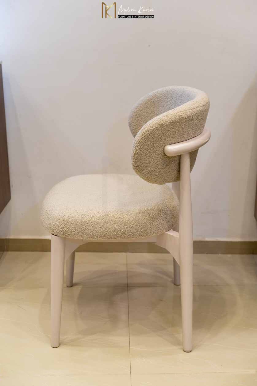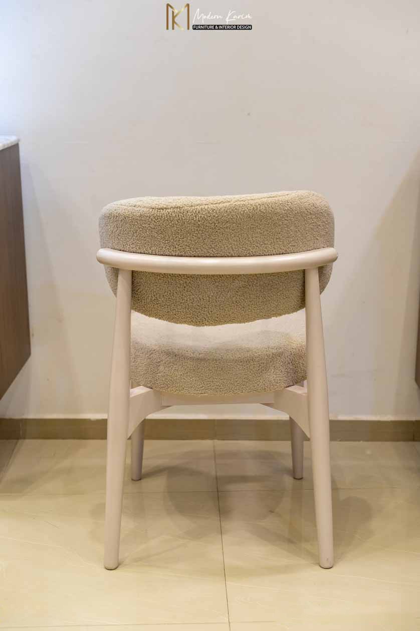 الكراسي تتميز بتصميم حديث يجمع بين الراحة والجمال، مع ظهر منحني مبطن ومقعد مريح مغطى بقماش فاتح. الأرجل الخشبية البيضاء تساهم في إضافة أناقة مع تصميم بسيط ومتناسق يتناغم تمامًا مع الترابيزة.