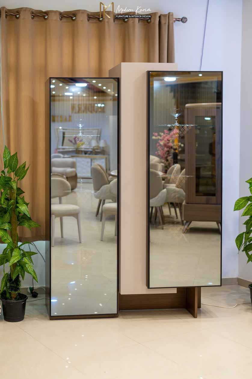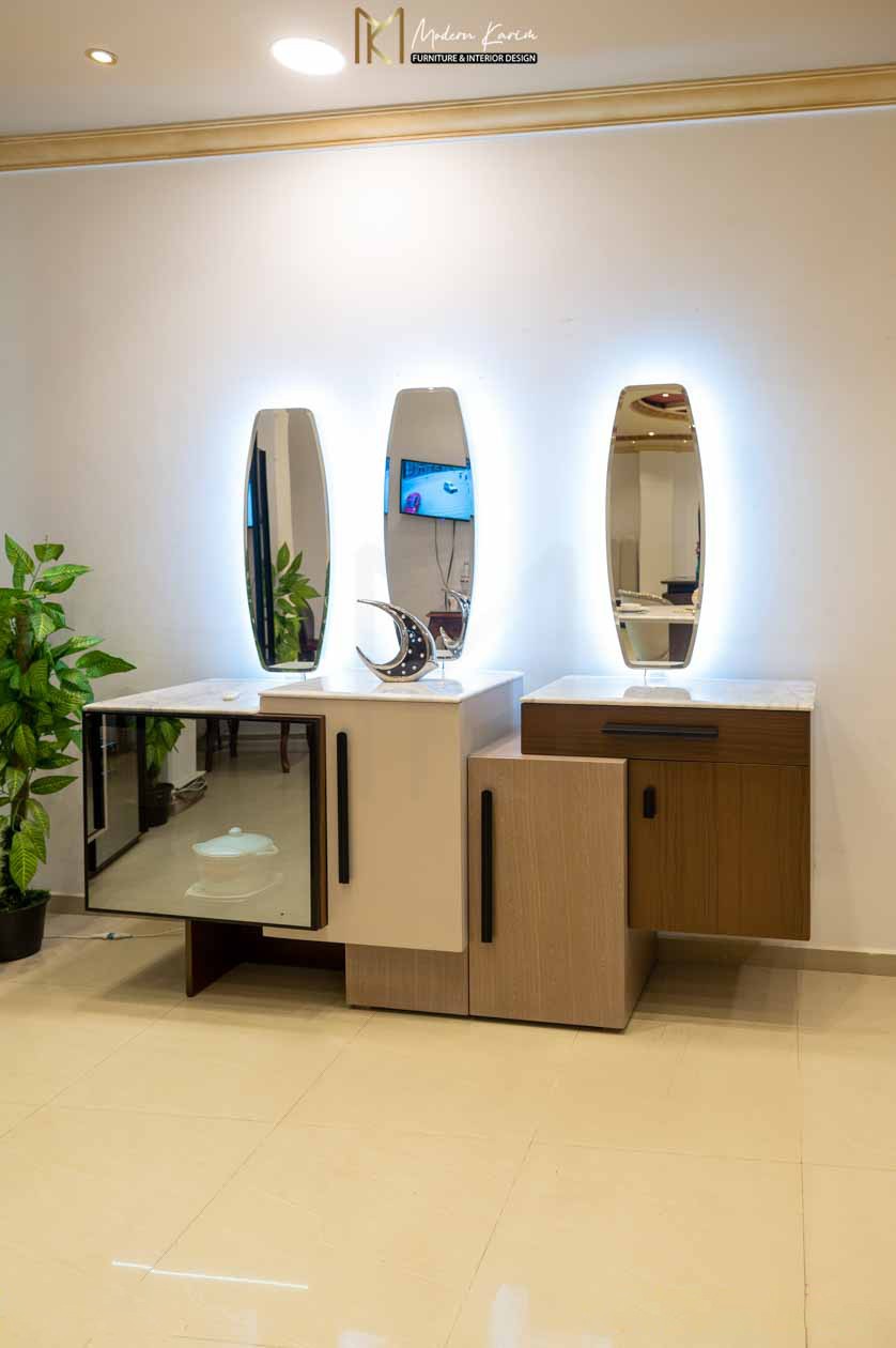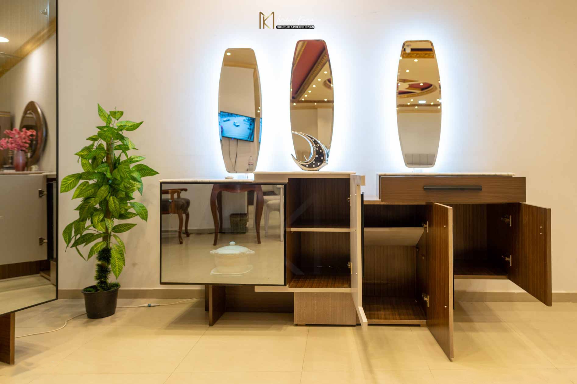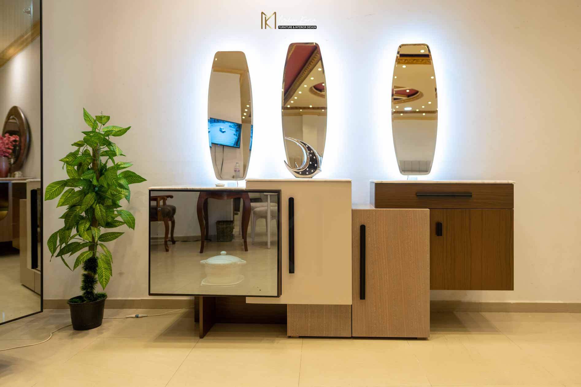 البوفيه العصري مصنوع من خشب عالي الجودة ويتميز بوحدات تخزين متعددة تتضمن أدراجًا وأبوابًا مغلقة. بعض الأبواب زجاجية شفافة لعرض الأغراض، بينما الأبواب المغلقة توفر مساحة تخزين مدمجة. السطح الرخامي الواسع مثالي لعرض التحف أو أدوات التقديم. مقابض الأبواب المعدنية تضيف لمسة من الفخامة، بينما التصميم العام بالخطوط النظيفة يناسب جميع أساليب الديكور. يحتوي البوفيه على ثلاثة أقواس مرآة كبيرة بحواف دائرية، مضاءة داخليًا لتعزيز الإحساس بالاتساع والجمال.