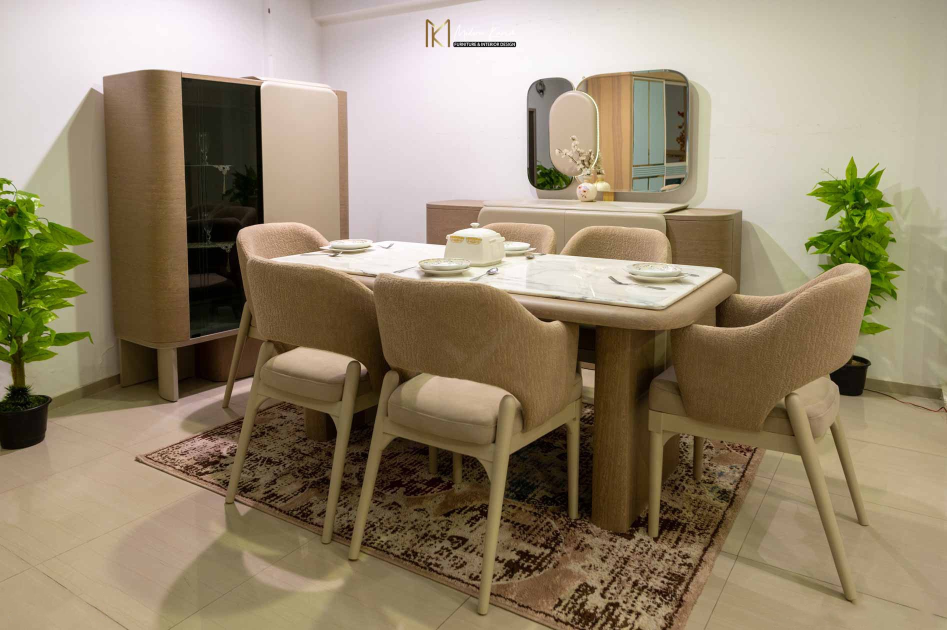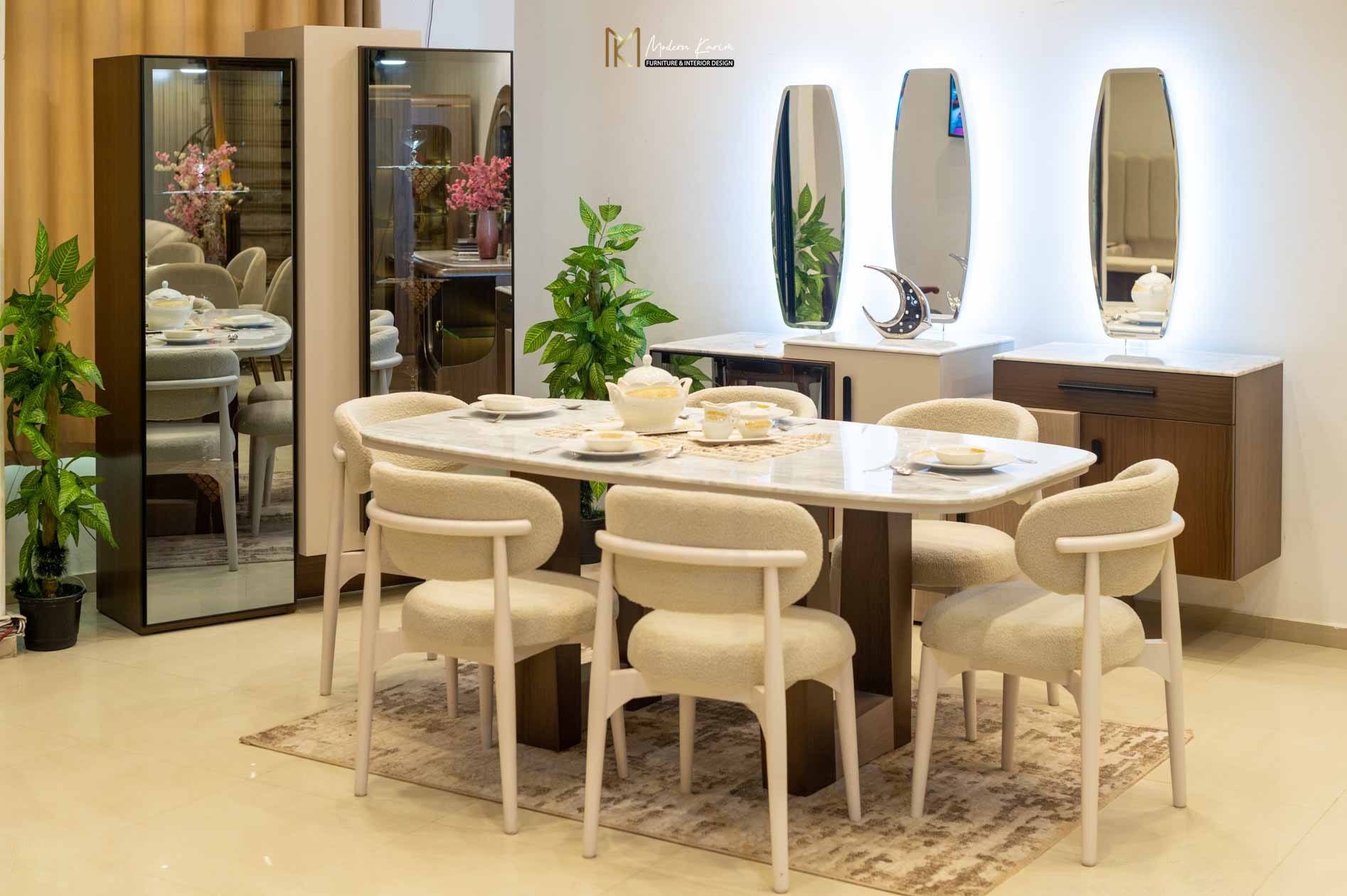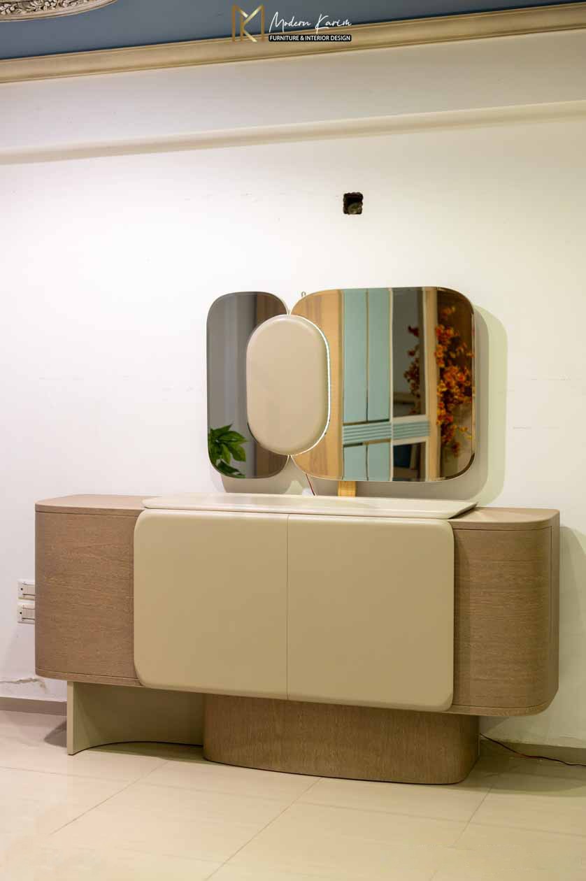 يكتمل الطقم ببوفيه خشبي فاخر بلون بني فاتح وأبواب بيج أنيقة، يتكوّن الجزء العلوي من البوفيه من إطار مرايا مميز بثلاثة أجزاء؛ مرأتان جانبيتان بتصميم مستطيل بزوايا منحنية، يتوسطهما جزء خشبي بشكل بيضاوي بلون بيج بدون مرآة، يضيف لمسة فنية أنيقة تعزز من جمال التصميم وتكامل الألوان.