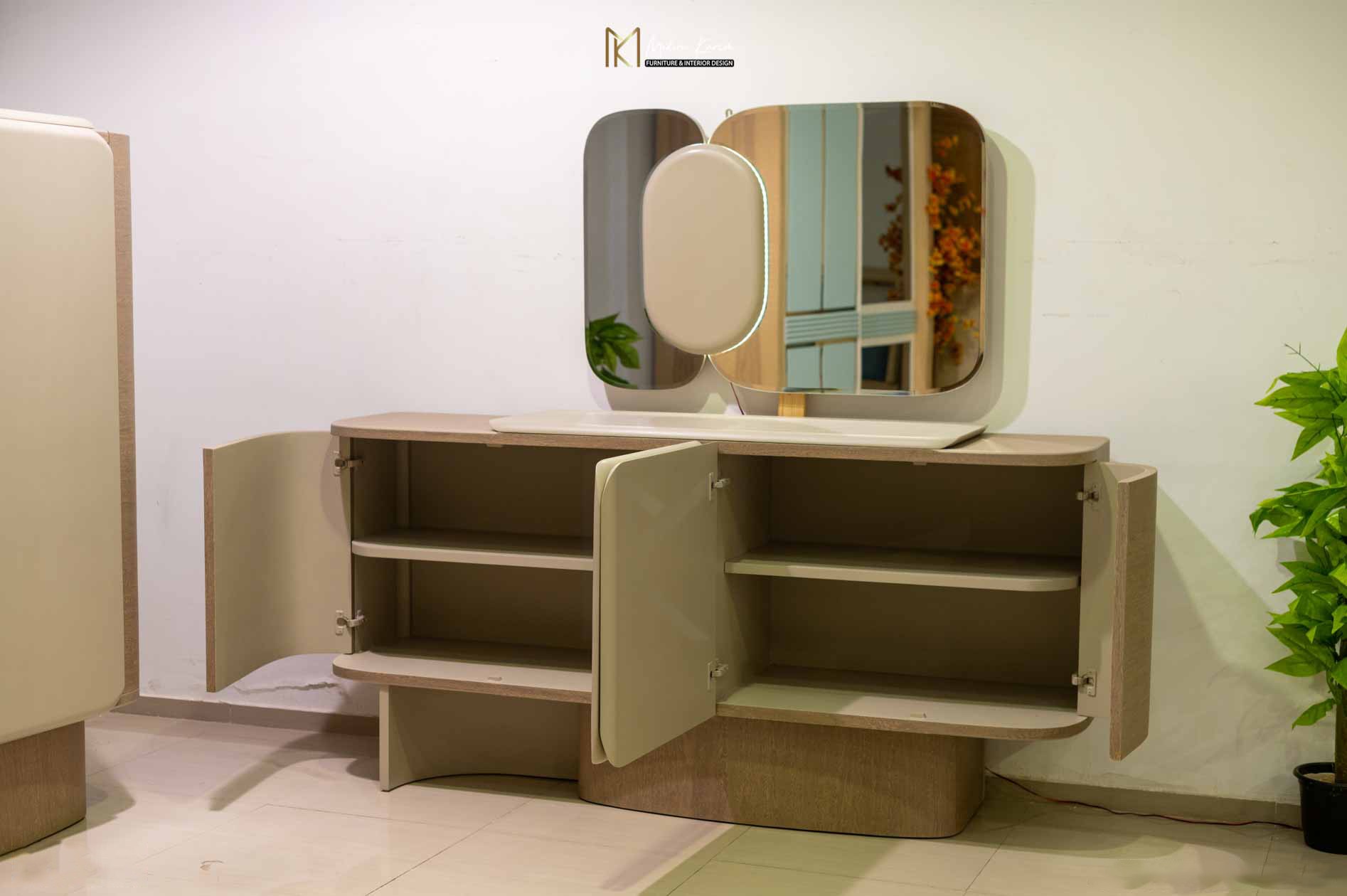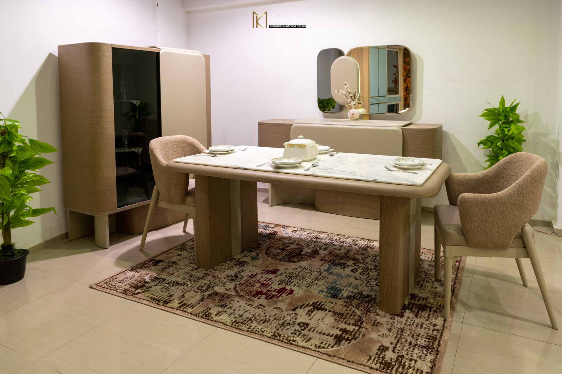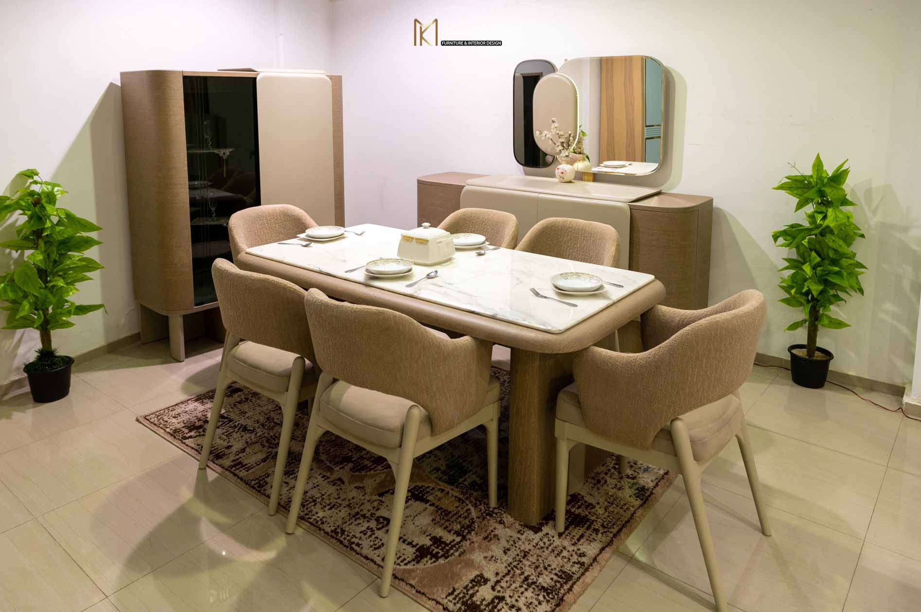 يكتمل الطقم ببوفيه خشبي فاخر بلون بني فاتح وأبواب بيج أنيقة، يتكوّن الجزء العلوي من البوفيه من إطار مرايا مميز بثلاثة أجزاء؛ مرأتان جانبيتان بتصميم مستطيل بزوايا منحنية، يتوسطهما جزء خشبي بشكل بيضاوي بلون بيج بدون مرآة، يضيف لمسة فنية أنيقة تعزز من جمال التصميم وتكامل الألوان.