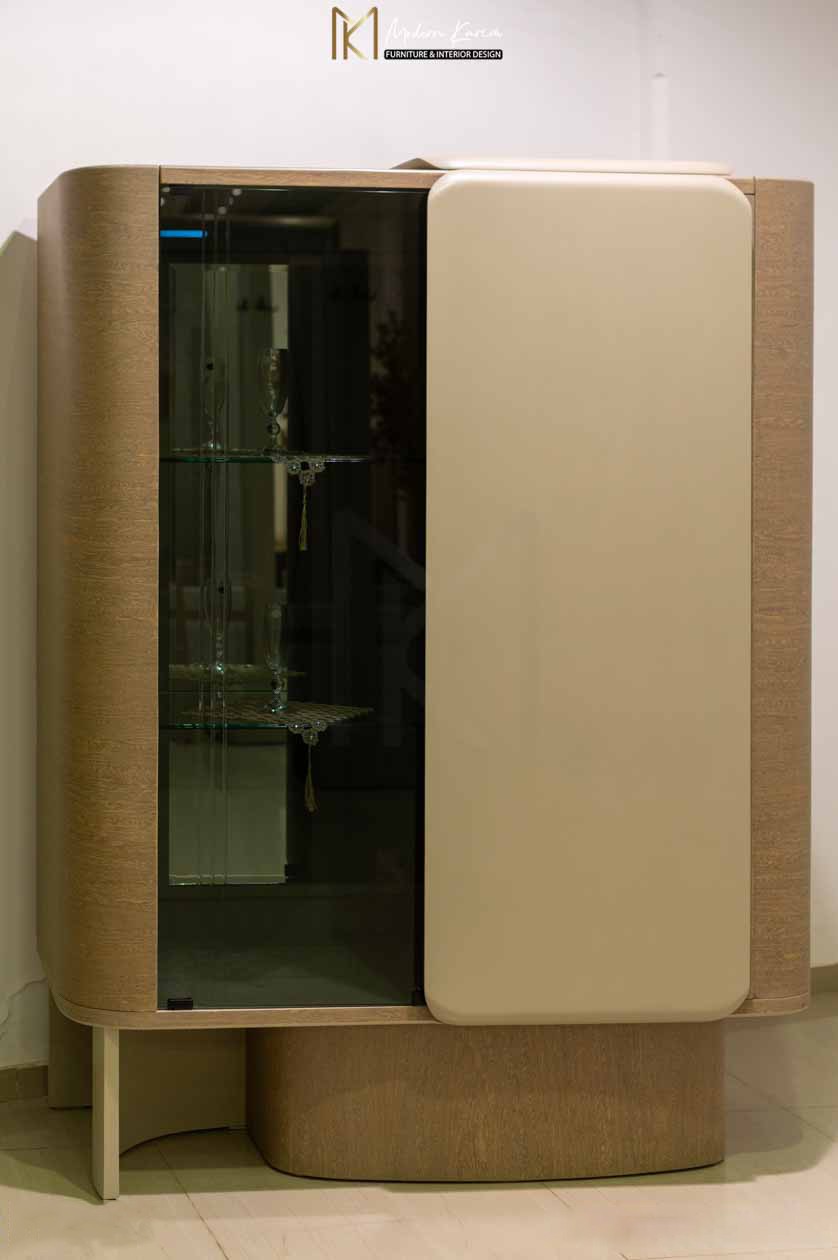 يشمل الطقم نيش مودرن يجمع بين الخشب والزجاج، مع باب زجاجي لعرض الأواني وباب بلون بيج للتخزين، بتصميم عملي وأنيق يناسب مختلف المساحات.
