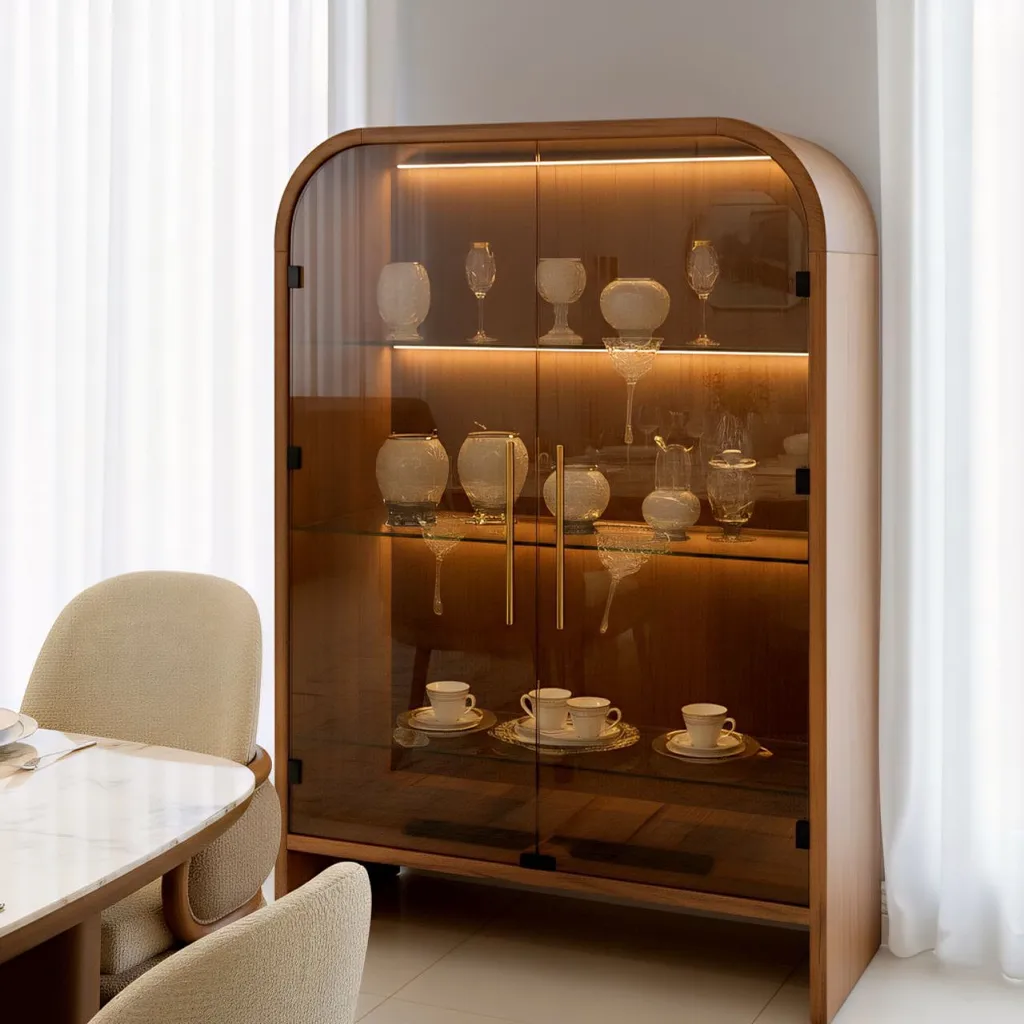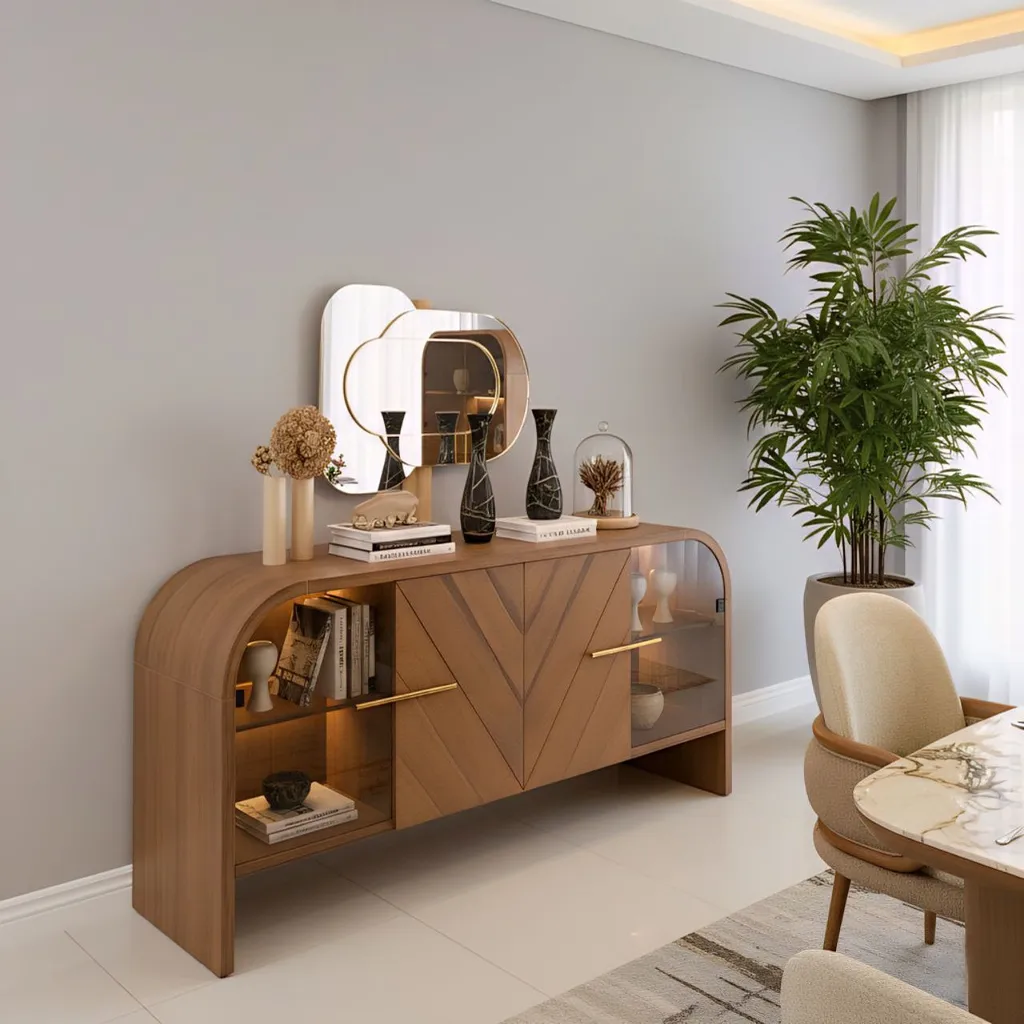 النيش الزجاجي بتقنية اللمس يقدم لك تجربة استخدام حديثة، بينما يضيف البوفيه وبرواز المرايا لمسة ديكور متكاملة للمكان، ليكتمل شكل السفرة الحديثة في أفضل صورة.