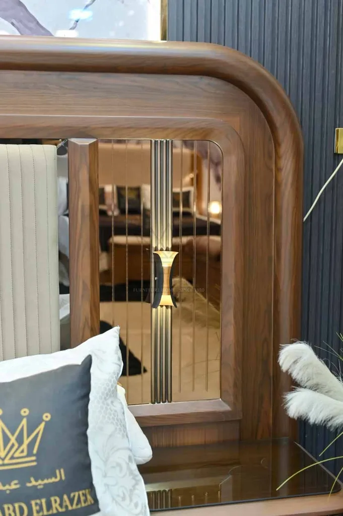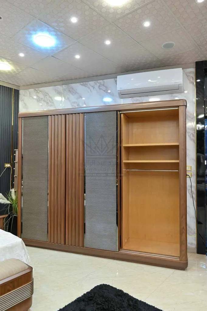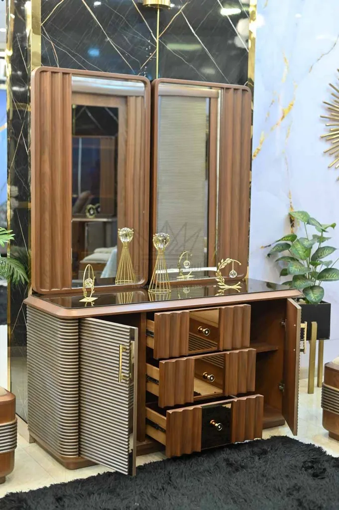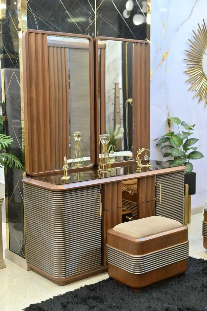 كما تضم الغرفة دولابًا واسعًا بمرآة كبيرة مدمجة وباب منزلق يسهل الاستخدام ويوفر مساحة تخزين متعددة. وتتميز التسريحة بتصميم حديث مع مرايا كبيرة ووحدات تخزين متنوعة، إلى جانب كرسي مخصص يكتمل به الطقم ليمنح تجربة استخدام مريحة.