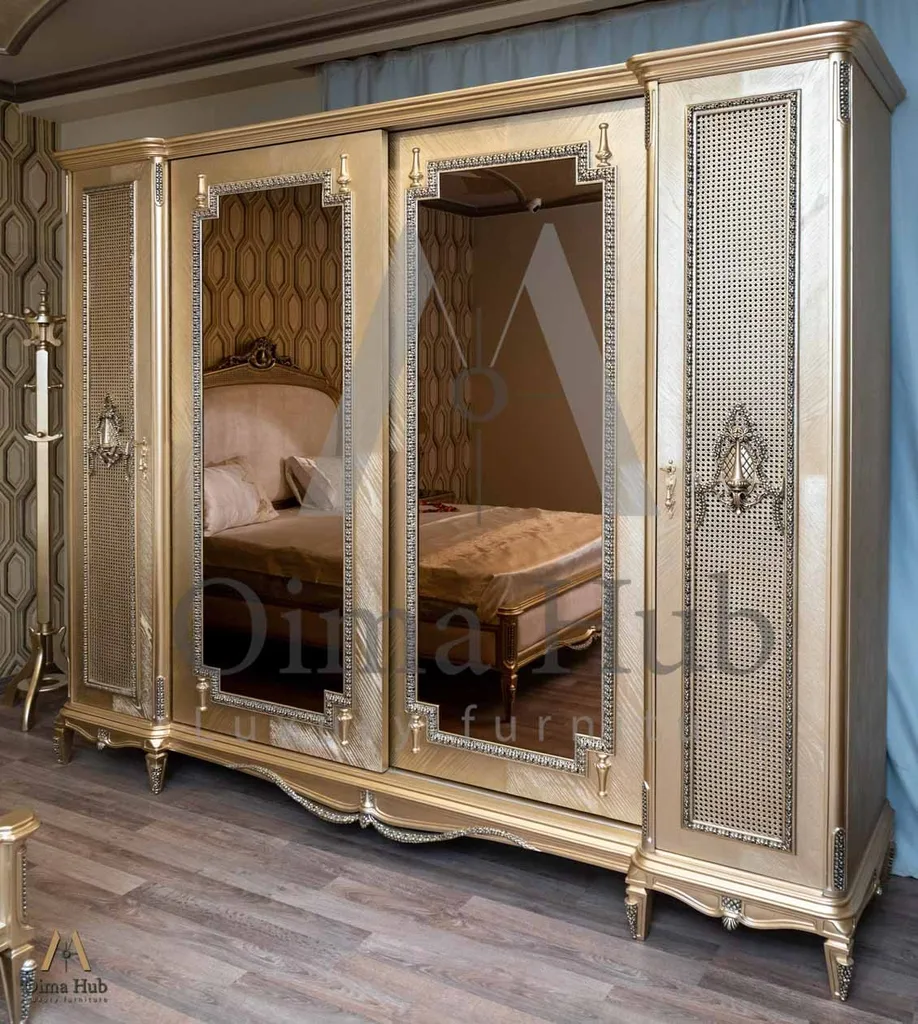 الدولاب يأتي بتصميم كلاسيك فاخر بأبواب واسعة، مزخرفة بإطارات منحوتة ولمسات فنية دقيقة، ويوفر مساحة تخزين مدروسة تجمع بين العملية والجمال.