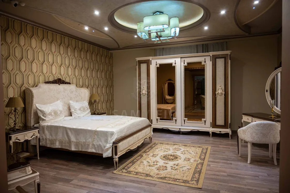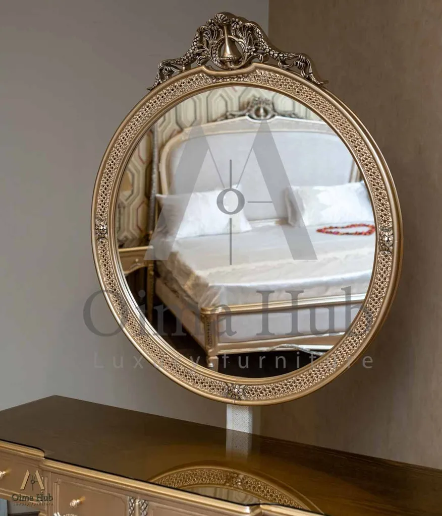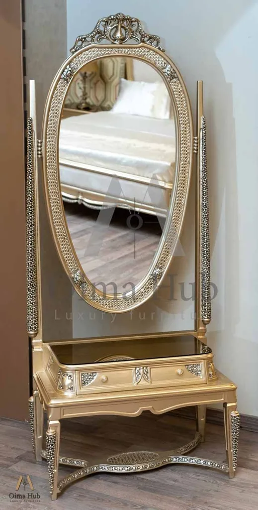 وتكتمل الغرفة بتسريحة أنيقة مزودة بمرآة بتصميم كلاسيكي متناسق، مع أدراج عملية تضيف استخدامًا يوميًا مريحًا، إلى جانب قطعة عسكري كلاسيك تضيف بعدًا عمليًا إضافيًا وتبرز فخامة التفاصيل اليدوية.