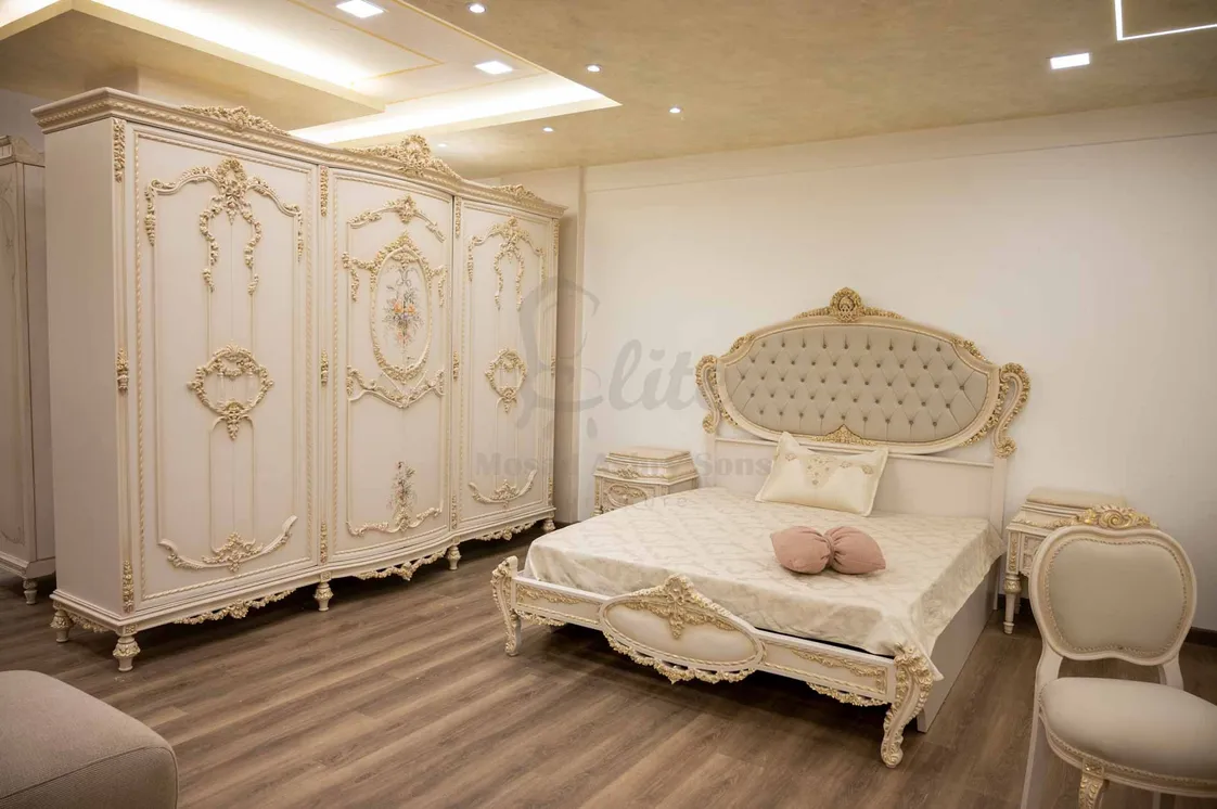 جميع القطع ترتكز على أرجل خشبية منحوتة هاند ميد بتشطيبات فاخرة، لتقدم غرفة نوم متناسقة تجمع بين الجمال الكلاسيكي والوظيفة العملية في تصميم واحد متكامل.