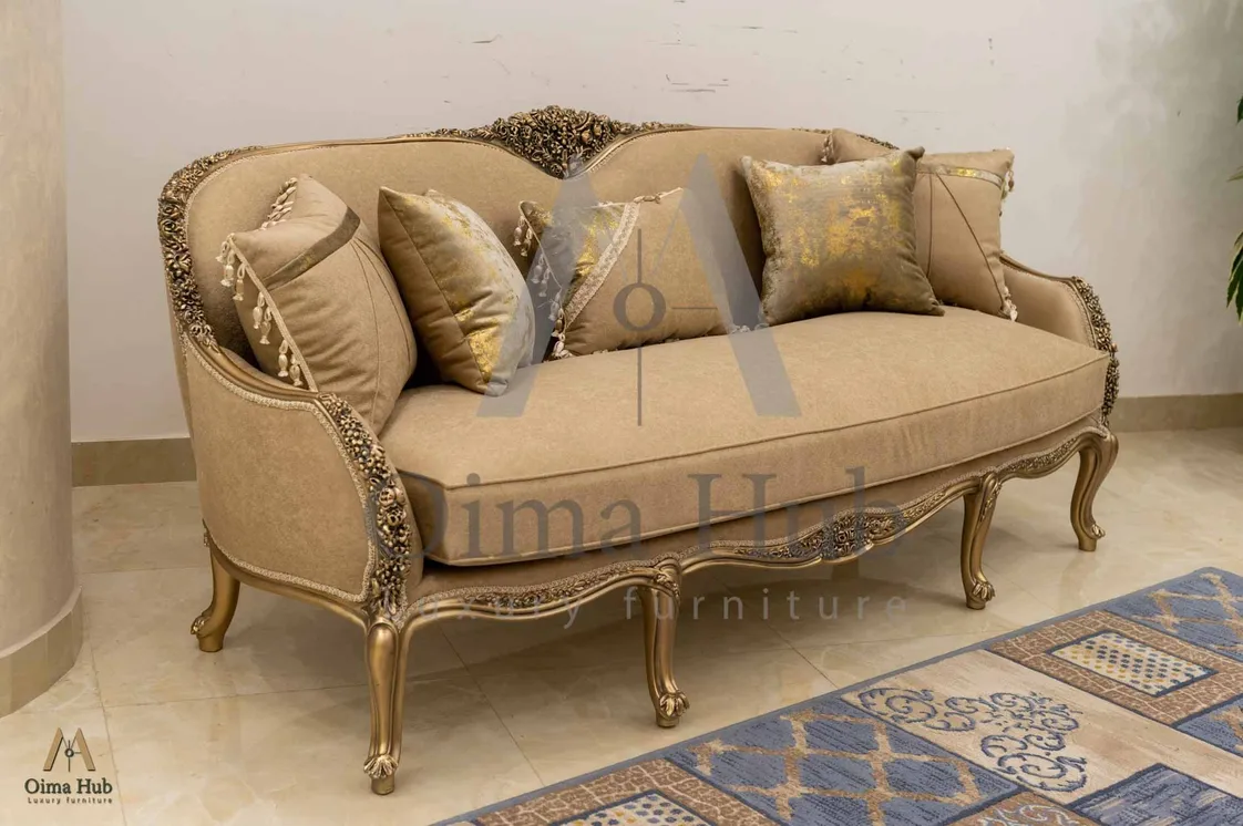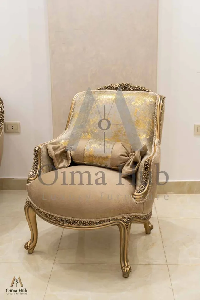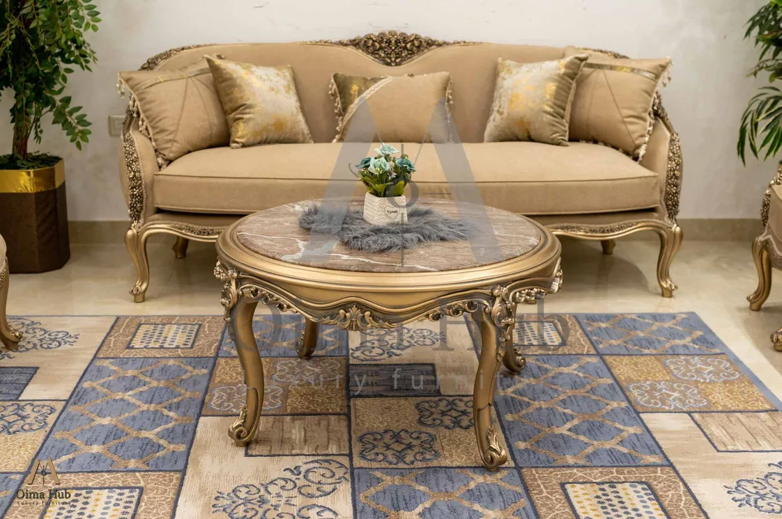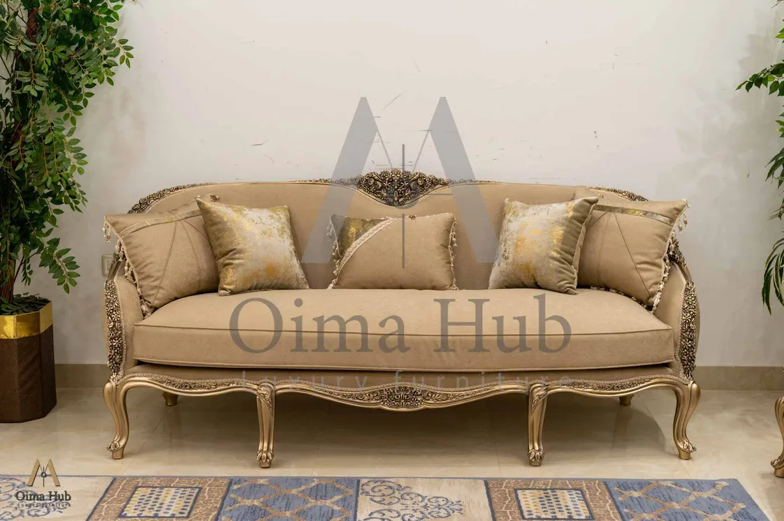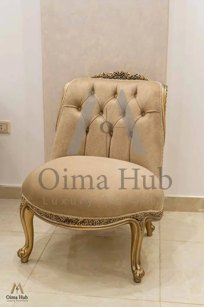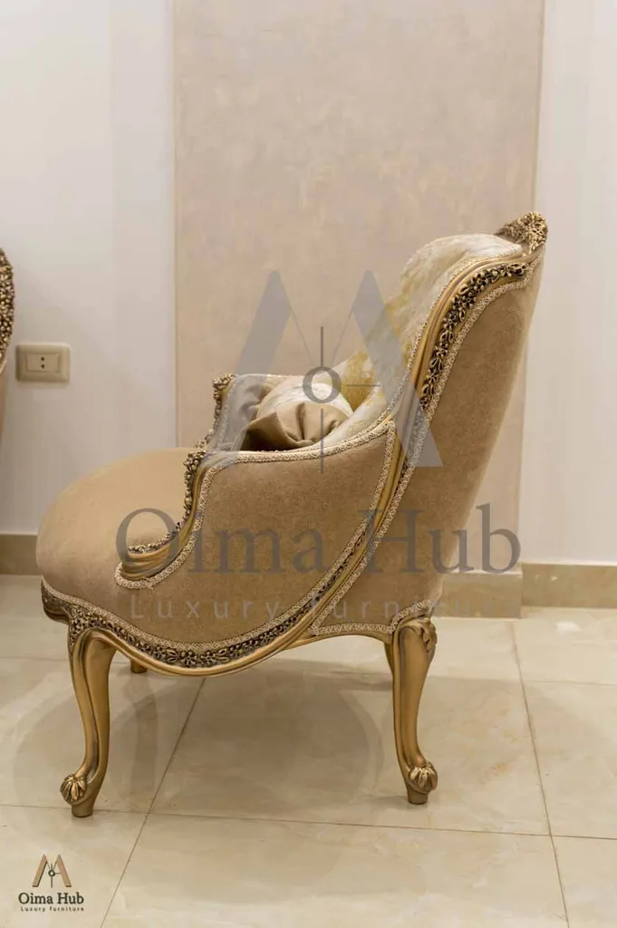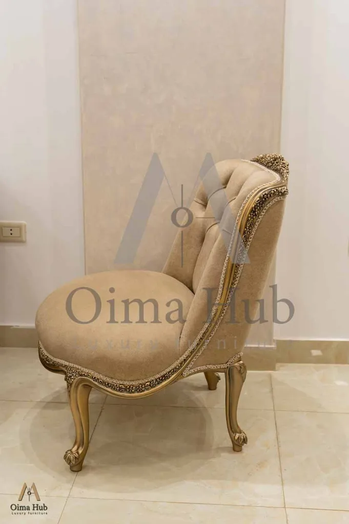 صالون نيو كلاسيك فاخر، بتصميم راقي يجمع بين العصرية والفخامة. يتسم بالأناقة الكلاسيكية العصرية مع تفاصيل زخرفية دقيقة تضفي لمسة من الفخامة على المساحة. القطع مصنوعة من خشب عالي الجودة مع تشطيبات مميزة تضيف لمسات فنية على الأثاث. الأرجل مزخرفة ومصممة بشكل منحوت يضفي توازنًا وجمالية على الأثاث.
