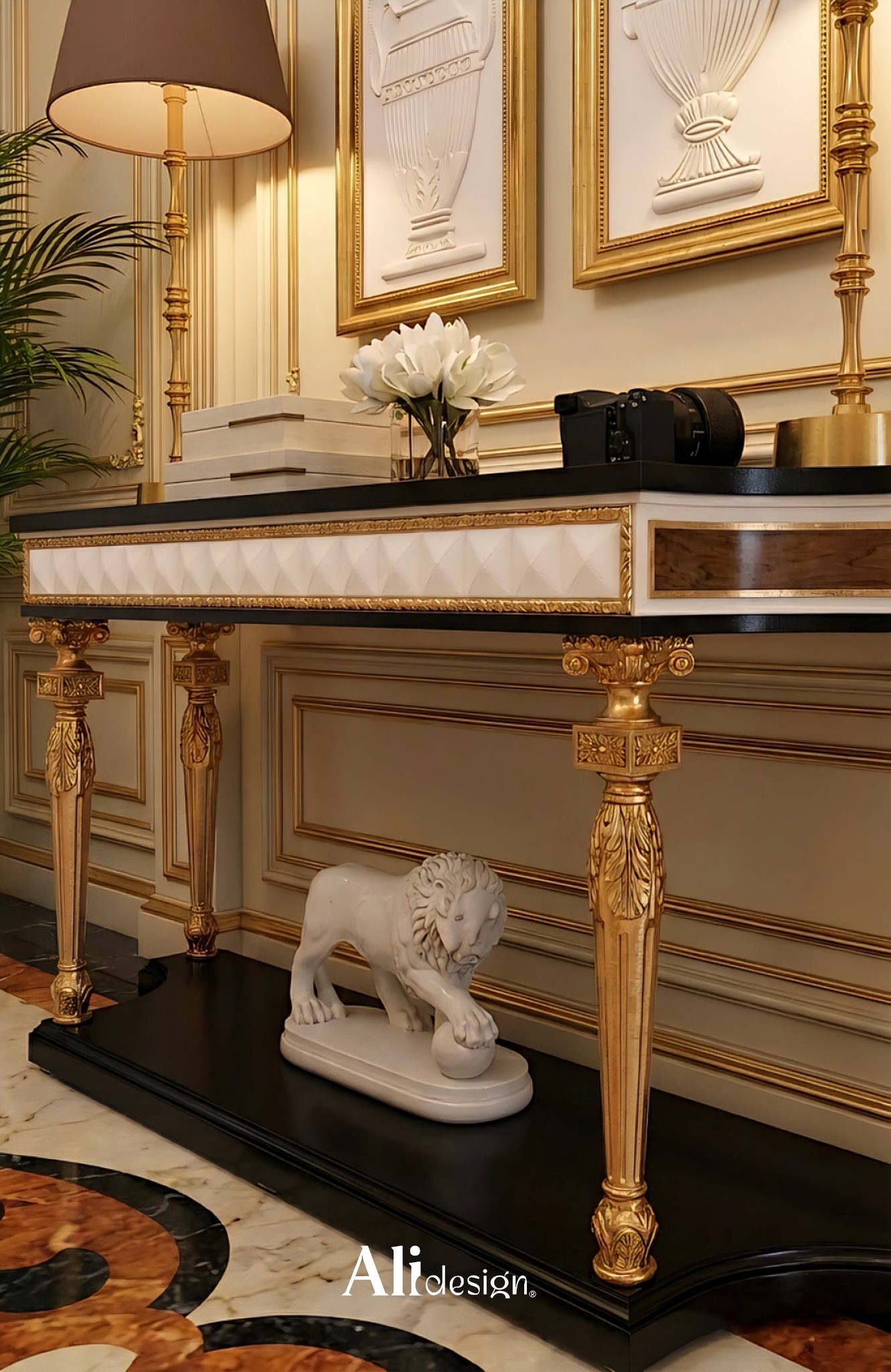 كونسول كلاسيك بتصميم راقٍ يعكس الفخامة والأناقة الخالدة، قطعة أساسية تضيف لمسة فنية مميزة لأي مدخل أو مساحة استقبال. يتميز بتفاصيل دقيقة ونِسَب متوازنة تبرز جمال الطابع الكلاسيكي وتمنح المكان حضورًا قويًا.