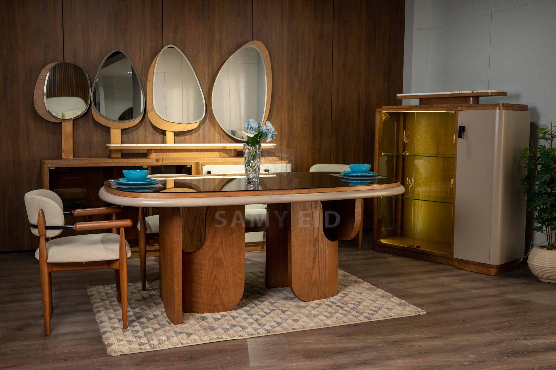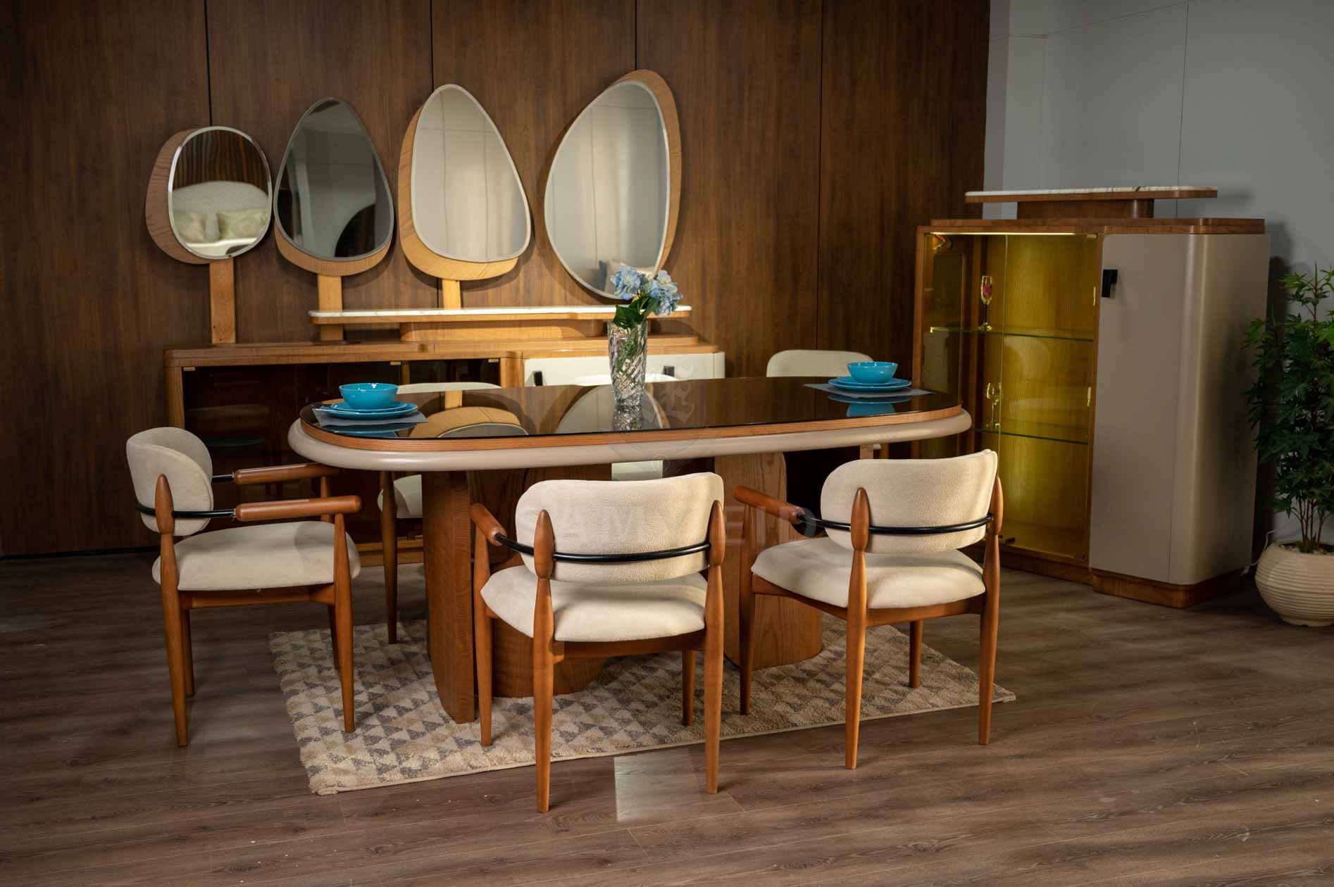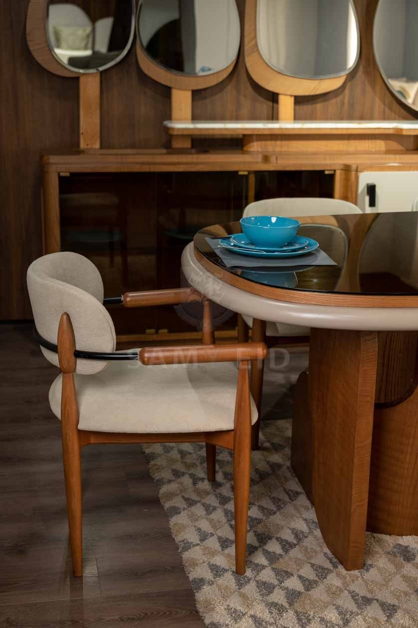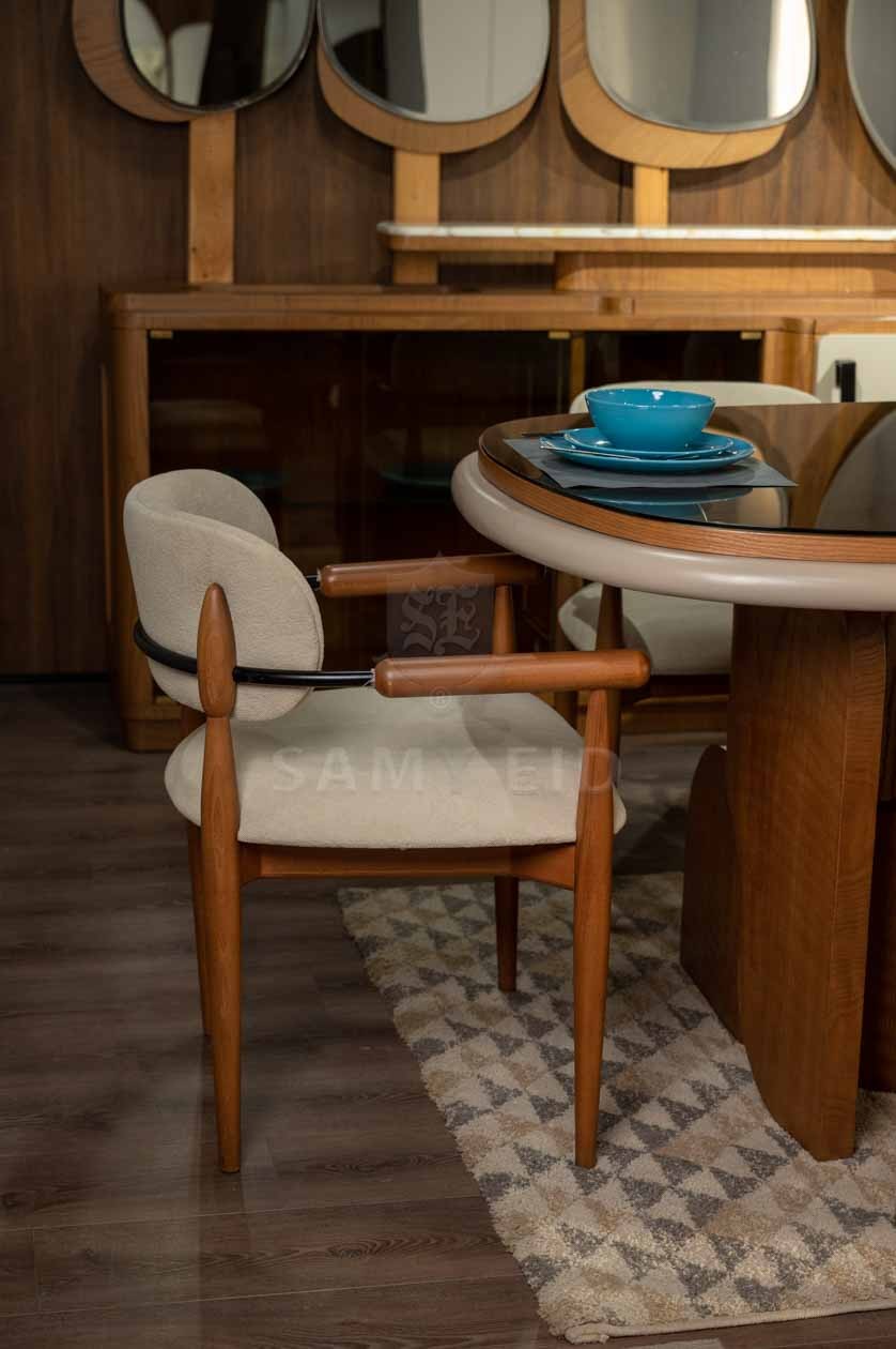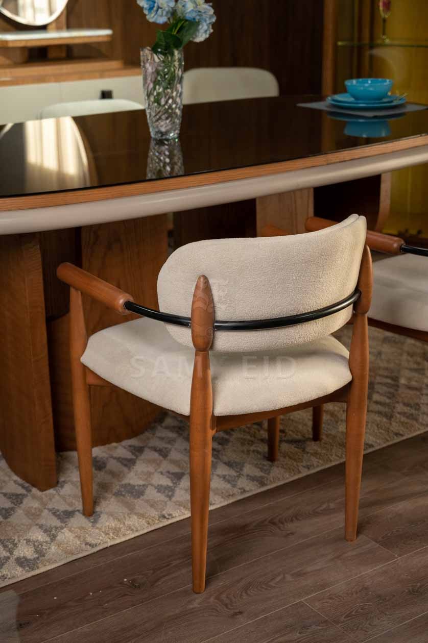 غرفة طعام مودرن بتصميم عصري راقٍ يجمع بين الدفء الطبيعي للون الخشبي وأناقة لون الأوف وايت، لتقديم مساحة طعام متوازنة تجمع بين الفخامة والبساطة. تعتمد على خطوط نظيفة وتفاصيل مدروسة تضيف لمسة عصرية هادئة تناسب مختلف أنماط الديكور.