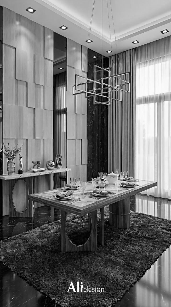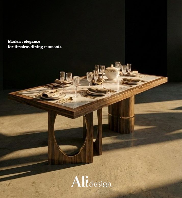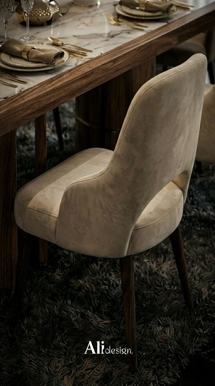 تتميز غرفة الطعام بخطوط مودرن هادئة تضمن أفضل استغلال للمساحة، مع سطح رخام عملي سهل التنظيف ومقاوم للاستخدام اليومي. تصميم الكراسي مريح وخفيف، مما يجعل الغرفة مثالية للاستخدام العائلي اليومي مع الحفاظ على الشكل الأنيق.