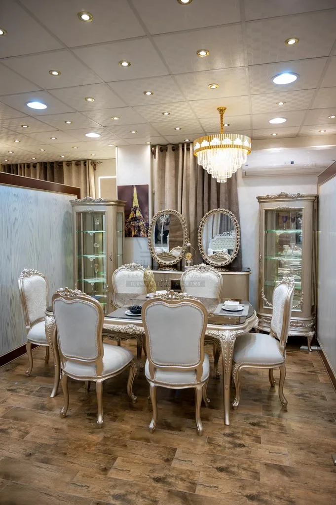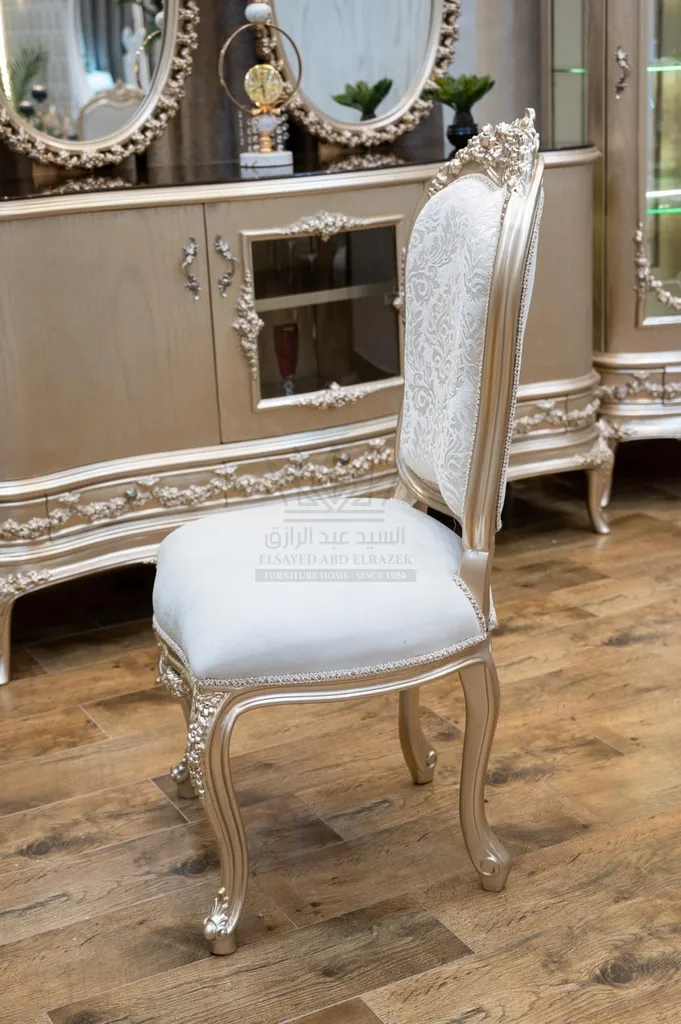 غرفة طعام كلاسيك بتجمع بين الفخامة والأناقة الكلاسيكية الأصيلة، تصميم راقي يناسب كل المساحات الكبيرة والمتوسطة. الألوان الهادية بتدي إحساس بالدفء والفخامة، والتشطيب المتقن يجعل كل قطعة تتحول لتحفة فنية داخل بيتك.