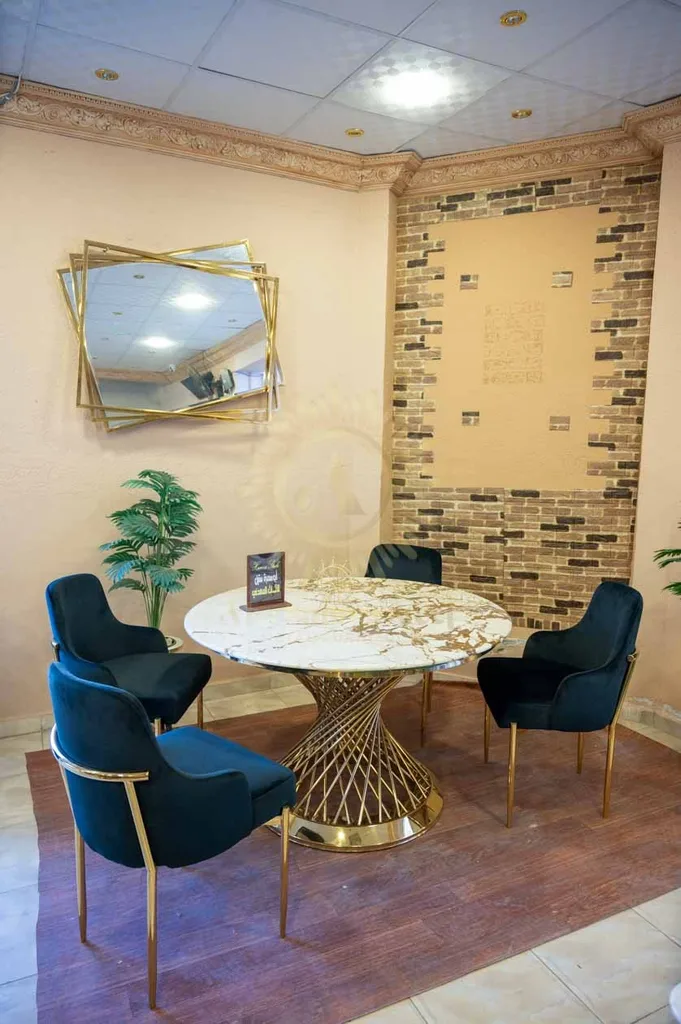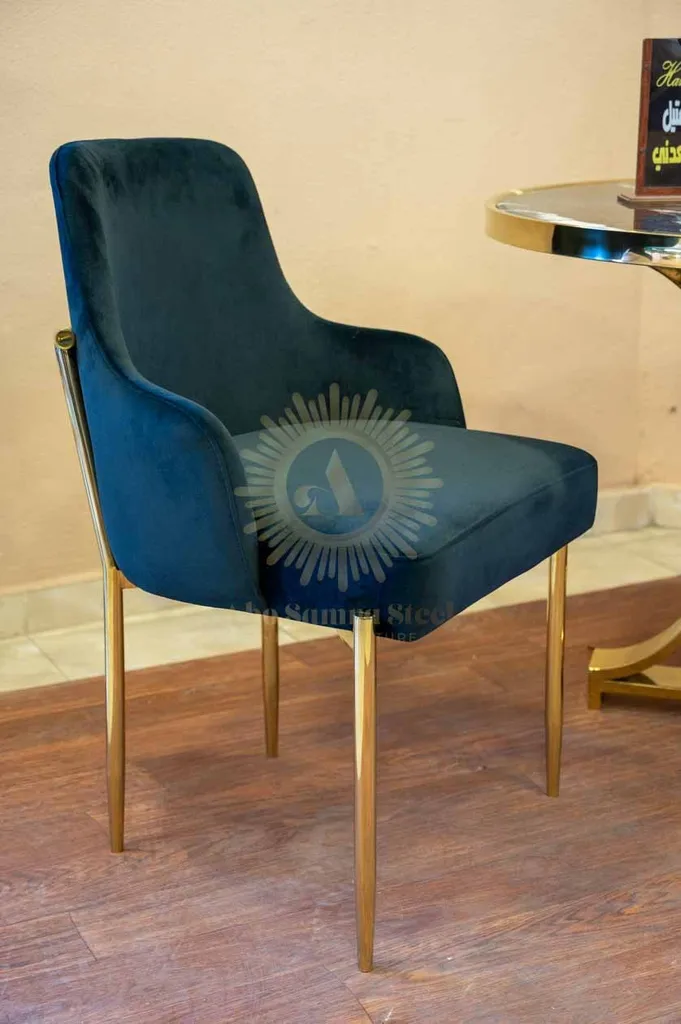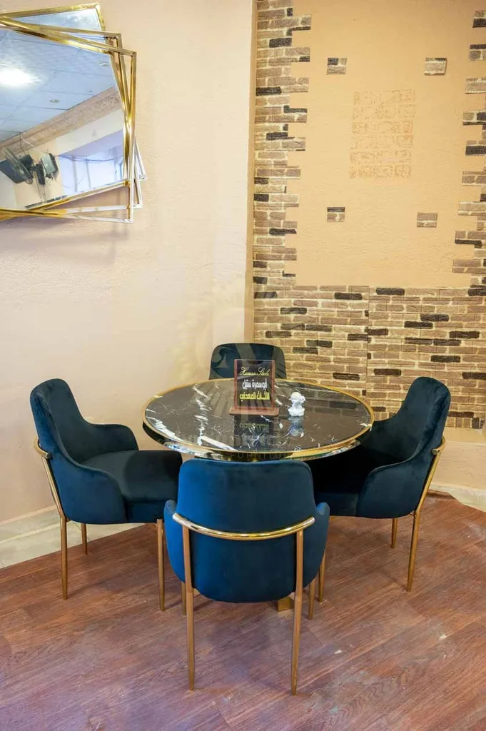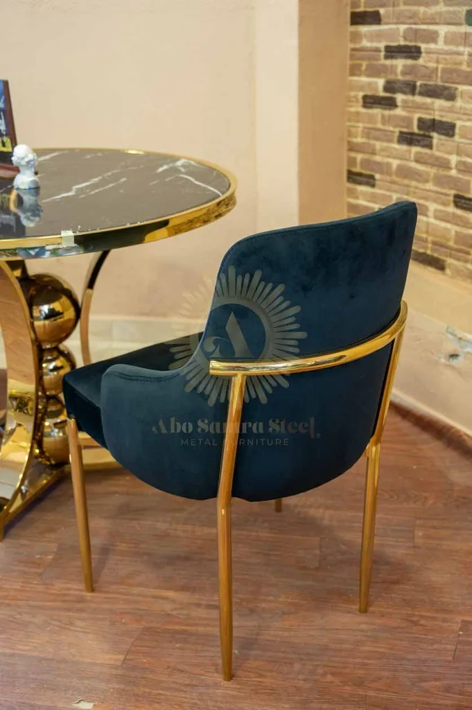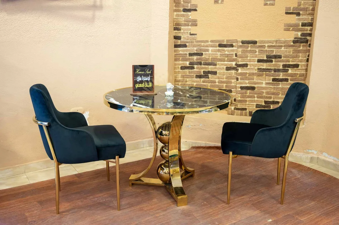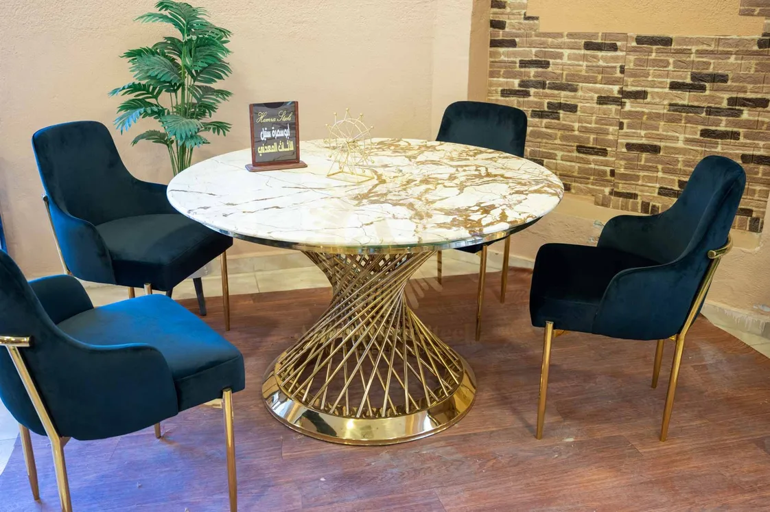 تأتي الغرفة مع 4 كراسي مريحة مكسوة بقماش أزرق فاخر معالج عالي الجودة، لتضيف لمسة جريئة وعصرية مع تفاصيل جولد أنيقة تناسب الديكورات المودرن والنيو كلاسيك.