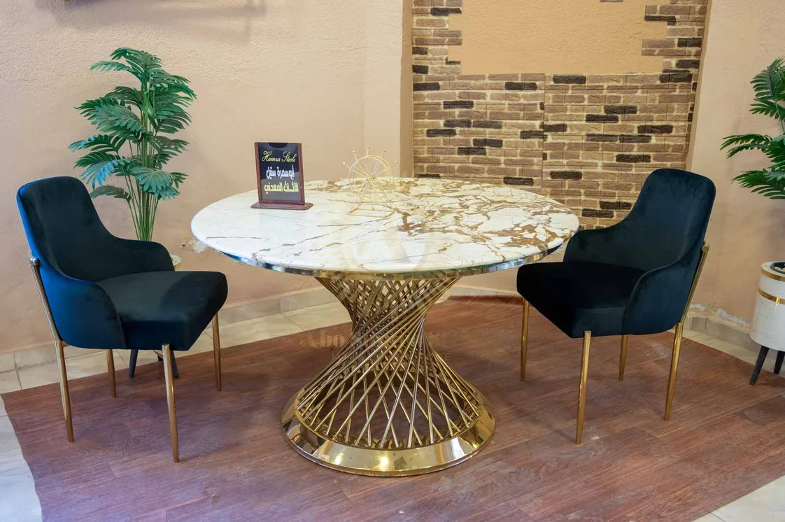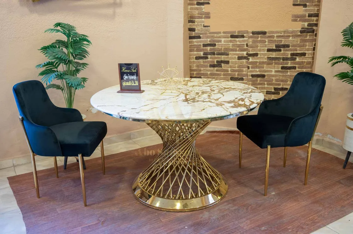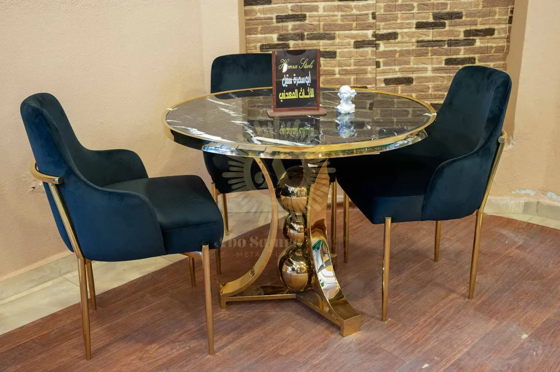غرفة طعام صغيرة ستانلس بتصميم عصري راقي، مثالية للمساحات الصغيرة والشقق الحديثة. تتميز الترابيزة بشكل دائري بقاعدة من الستانلس ستيل عالي الجودة باللون الجولد، مع سطح أنيق يمنح الغرفة توازنًا بصريًا وانسيابية في الحركة.