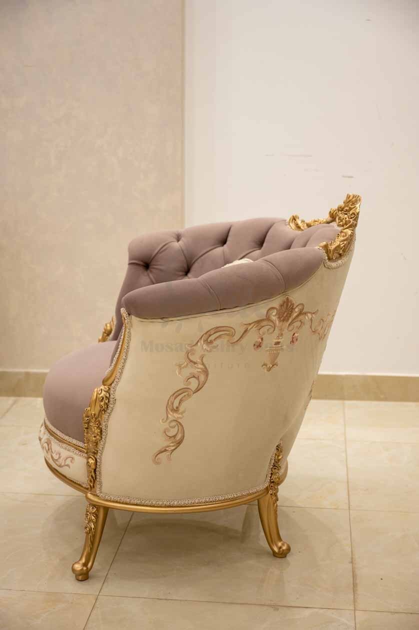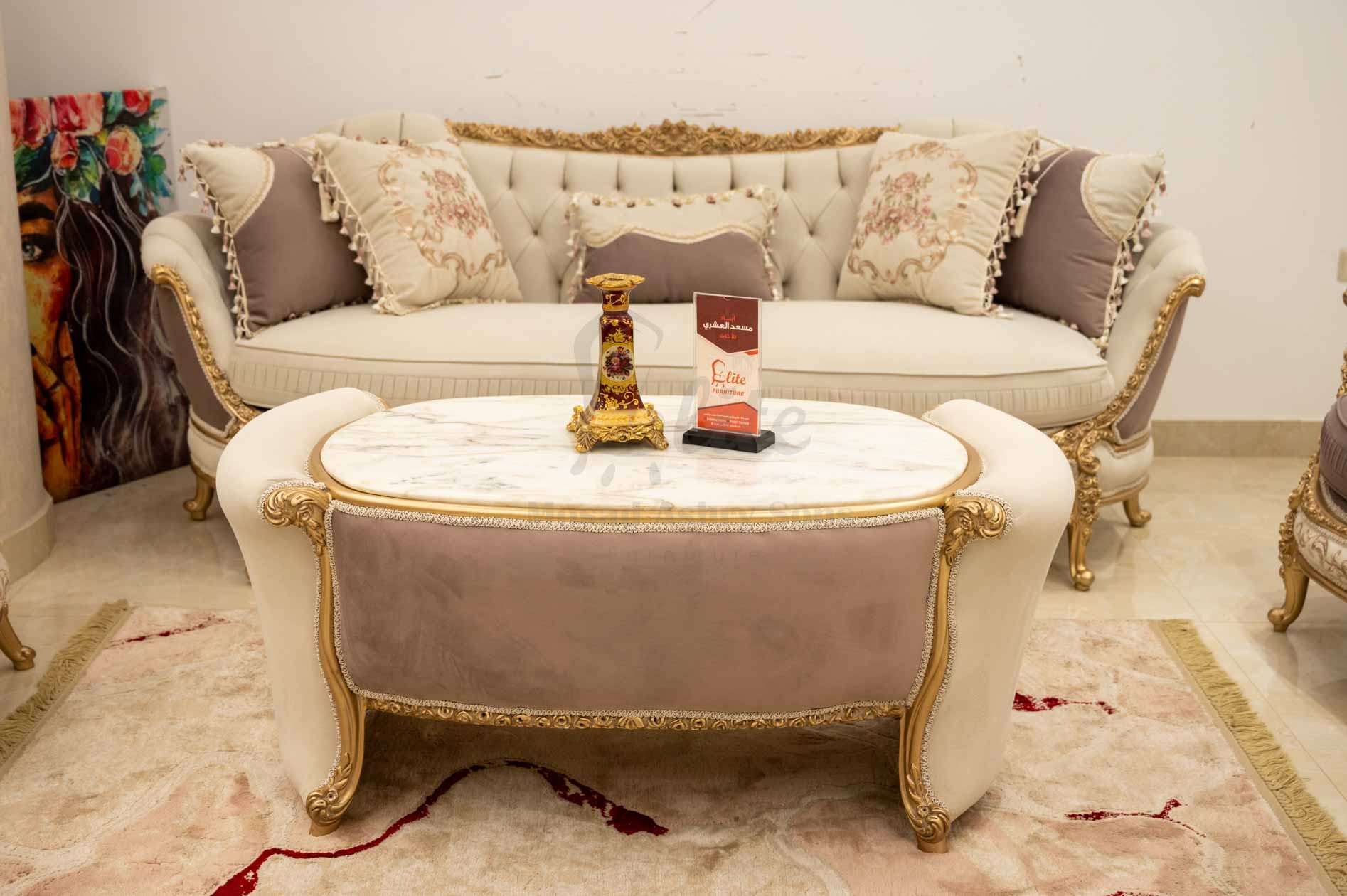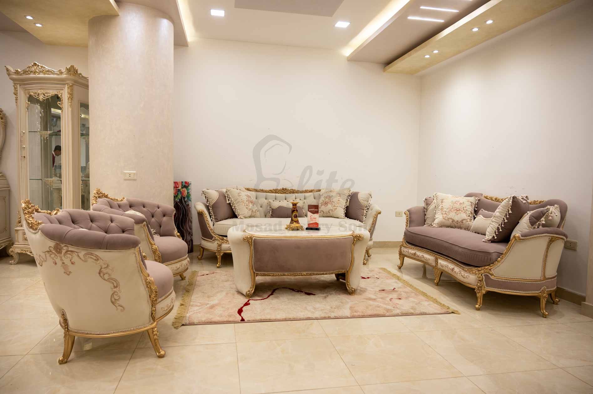 صالون نيو كلاسيك يجمع بين الأناقة والفخامة العصرية، تصميمه متناسق ليضفي لمسة راقية على غرفة المعيشة.