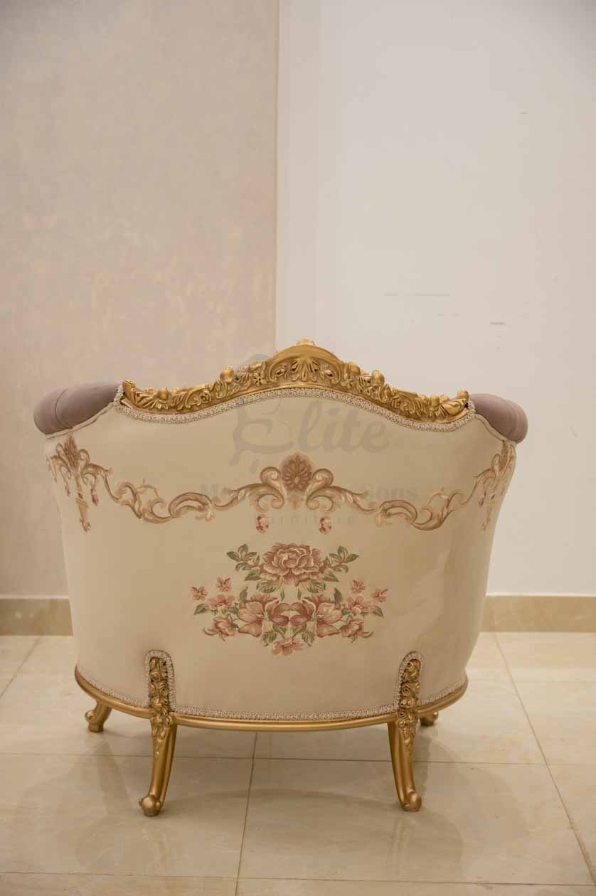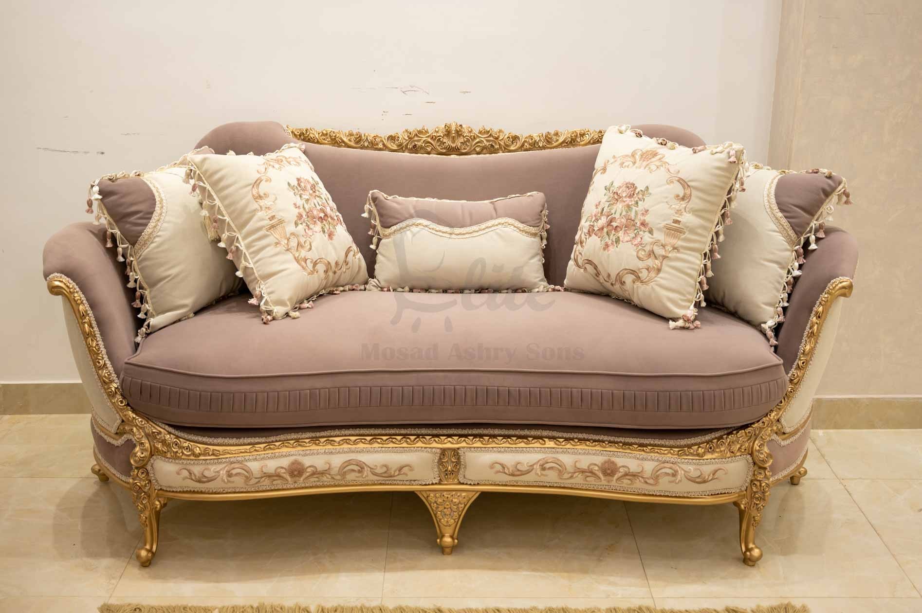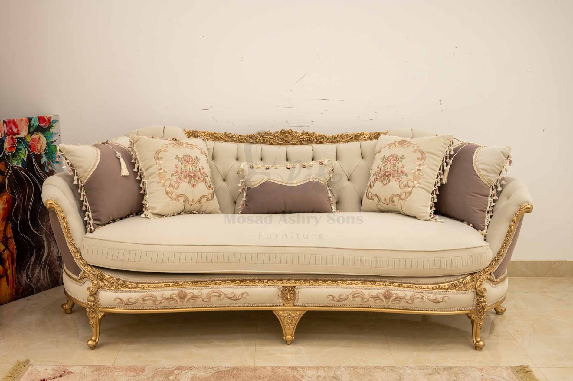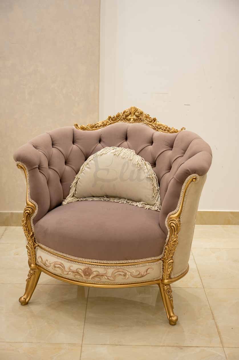 صالون نيو كلاسيك يجمع بين الأناقة والفخامة العصرية، تصميمه متناسق ليضفي لمسة راقية على غرفة المعيشة.