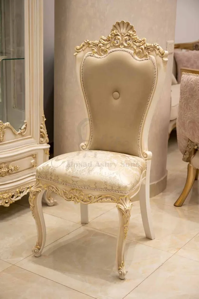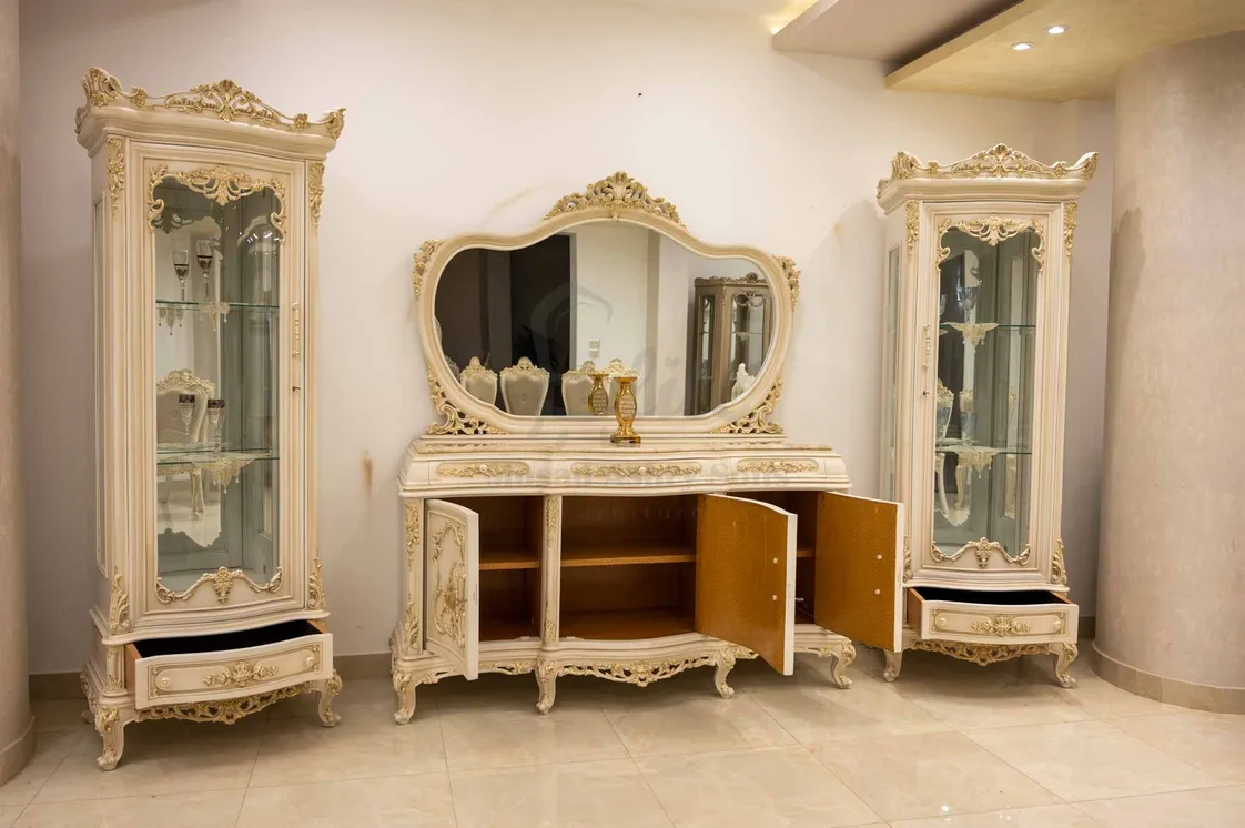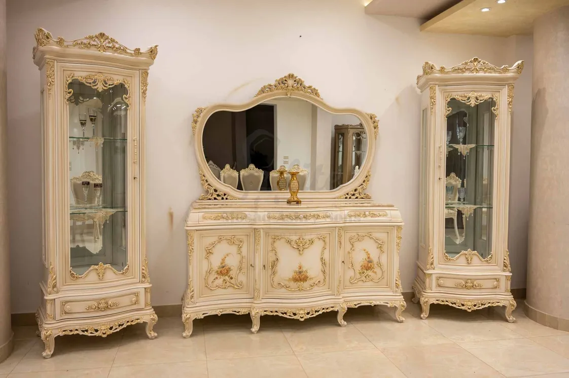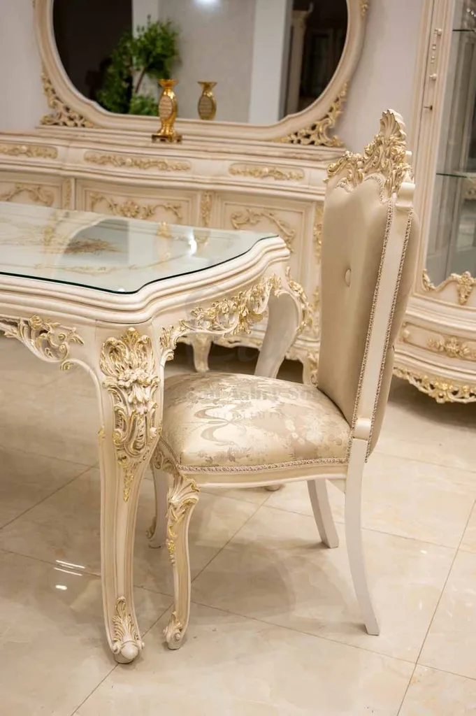 اللون أوف وايت مع الجولد يبرز فخامة الغرفة، بينما الأويـمـة بحفر يدوي تضيف تفاصيل فنية راقية تميز التصميم عن أي غرفة طعام عادية.