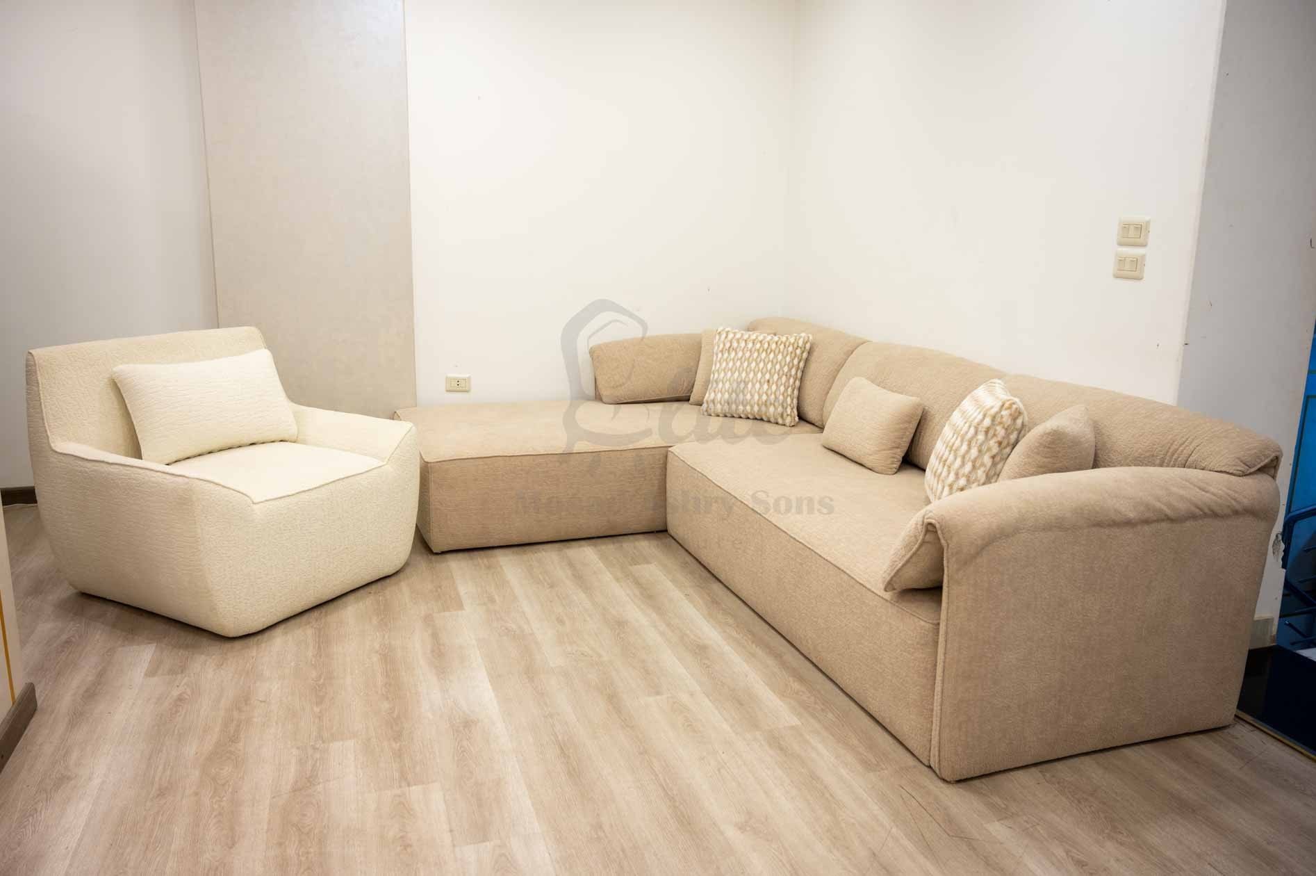 توفّر الركنة مساحة جلوس واسعة ومريحة، بينما تضيف الكنبة الفوتيه لمسة إضافية من الراحة والفخامة.