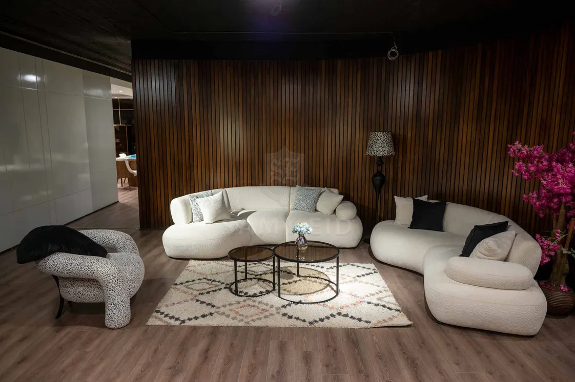 غرفة معيشة مودرن بتصميم أنيق يجمع بين البساطة والفخامة، مناسبة لمختلف المساحات العصرية. التكوين المتوازن بين الكنبة الكبيرة والكنبة الوسط مع فوتيهين يوفر راحة مثالية وتوزيع عملي للجلوس، مع ترابيزة سنتر من الخشب الطبيعي بسطح رخامي تضيف لمسة قوة وأناقة للتصميم العام. اختيار عملي لمحبي الذوق الراقي والراحة اليومية مع خامات عالية الجودة تدوم لسنوات.
