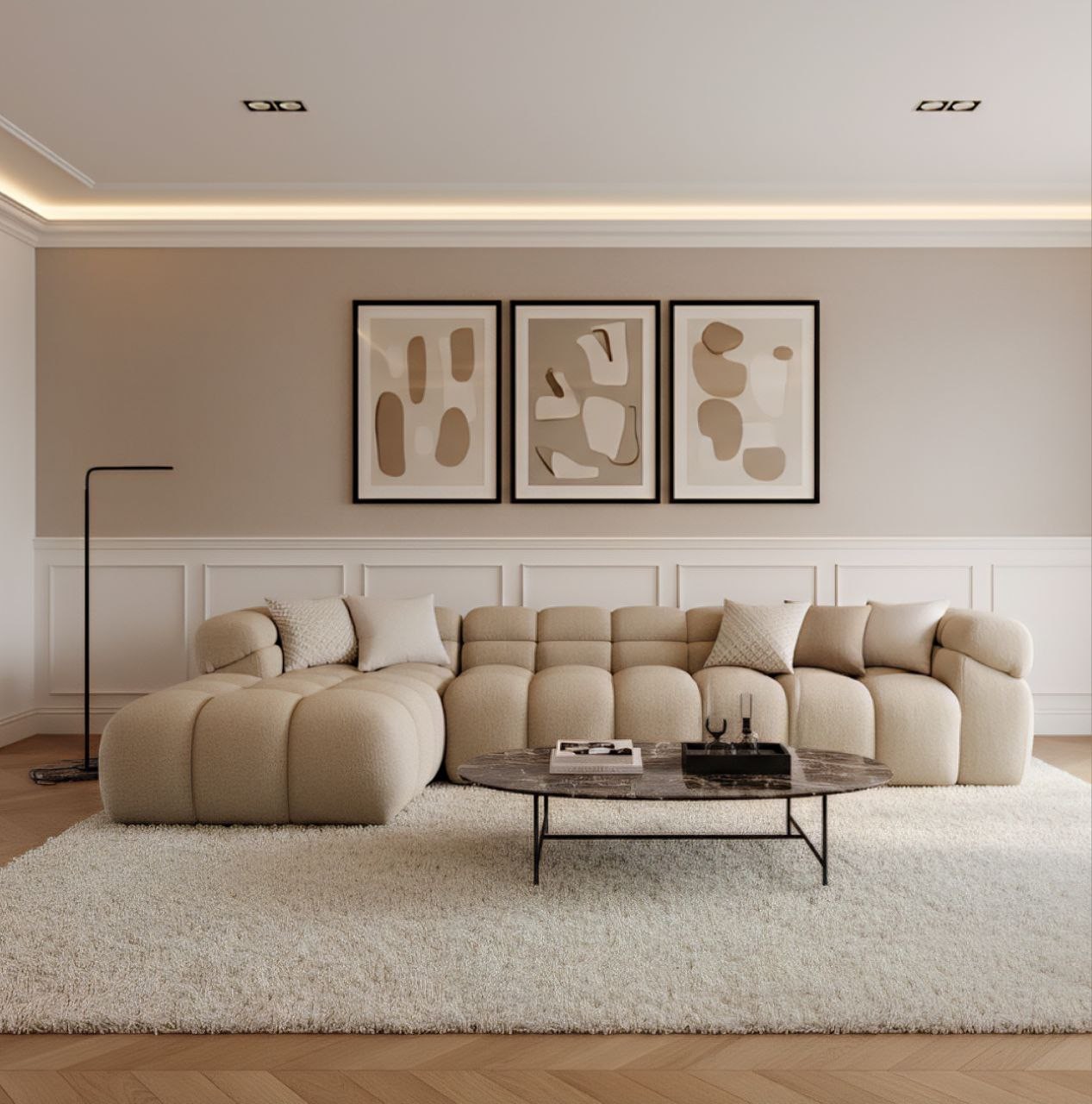 الأبعاد: العرض 350×350سم - الارتفاع 70سم - العمق 85سم الخشب: زان القماش: قطيفة
