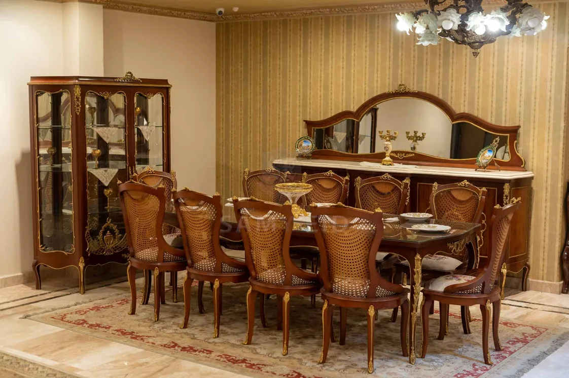 غرفة طعام كلاسيك مكونة من ترابيزة و6 كراسى مع وحدة عرض خشبية بالطراز الكلاسيكى