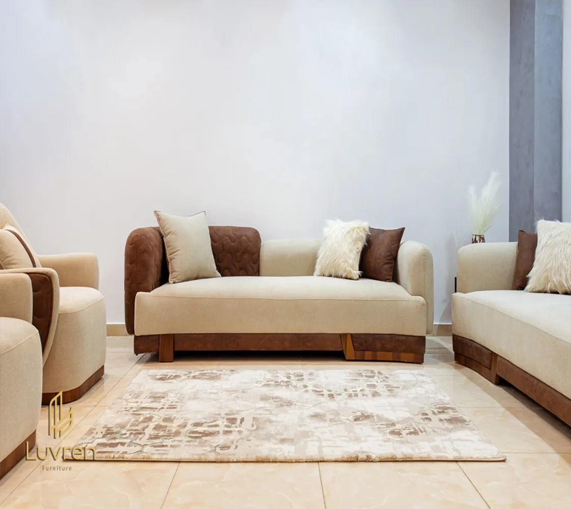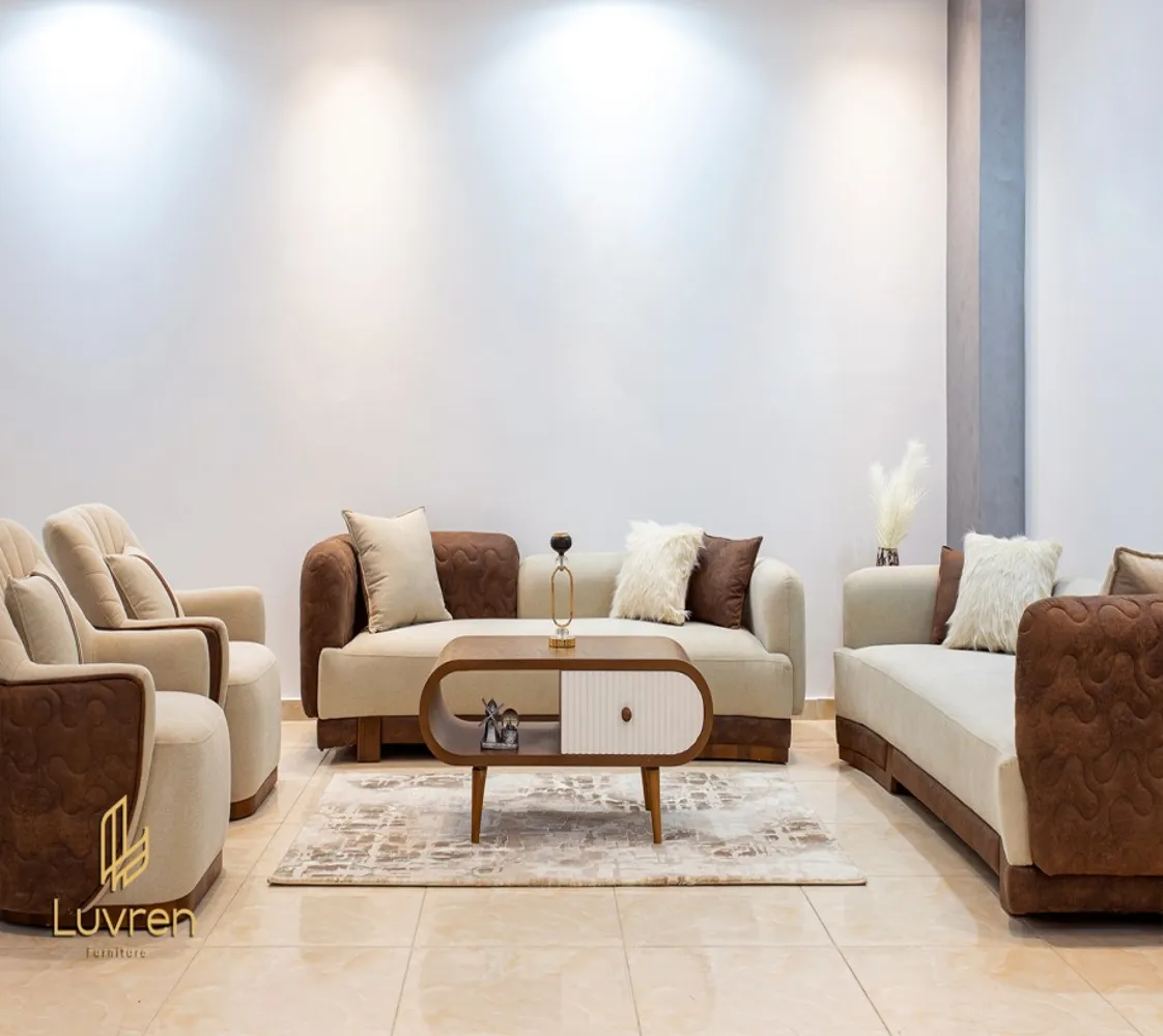 غرفة معيشة كنبة كبيرة ثلاثى وكنبه ثنائى مع 2 فوتيه وترابيزة من الخشب الطبيعى ذو طابع عصرى