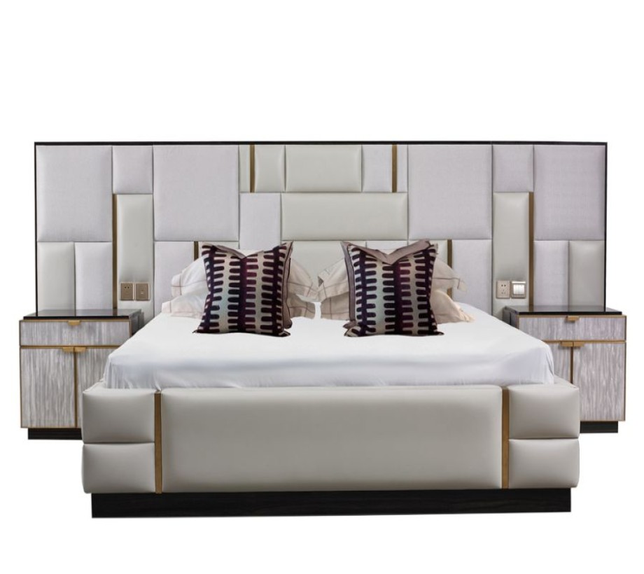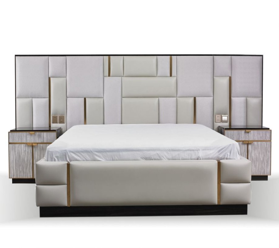 الوصف: سرير مع 2 كومود (عرض 55) الأبعاد: العرض 300 × 180 سم - الارتفاع 110 سم - العمق 200 سم الخشب: طبيعي القماش: جلد