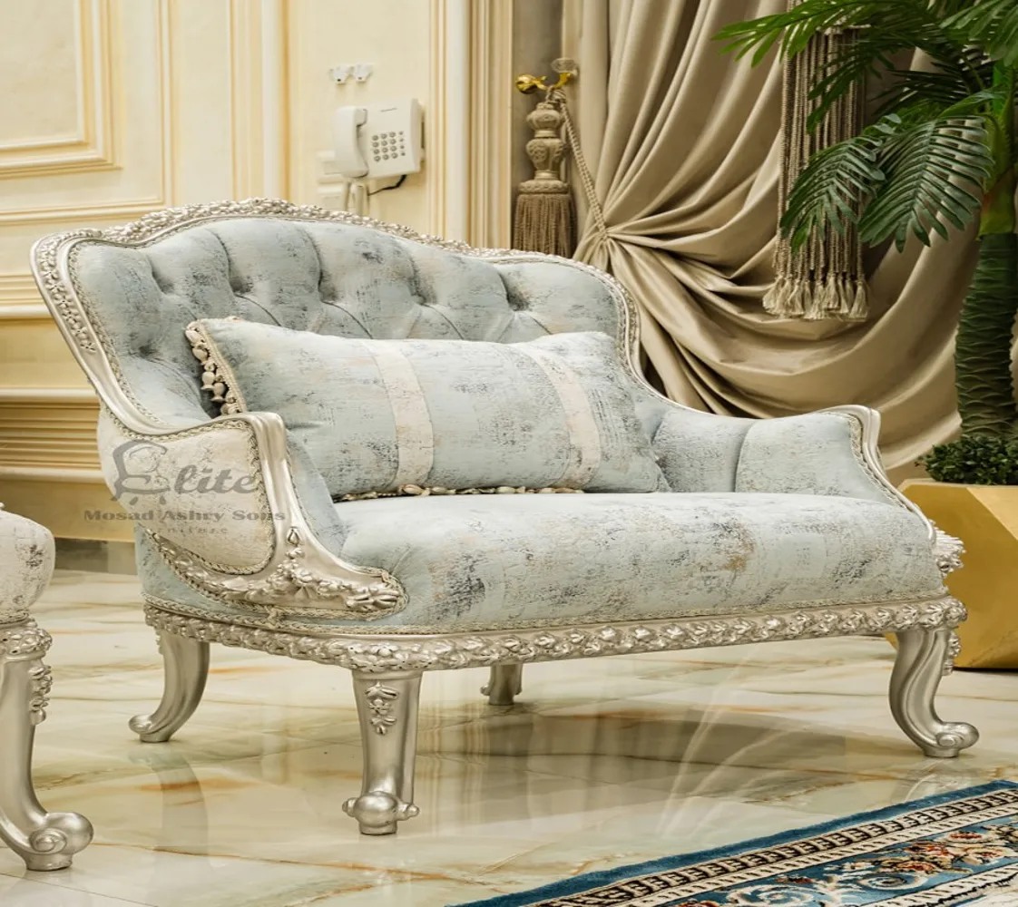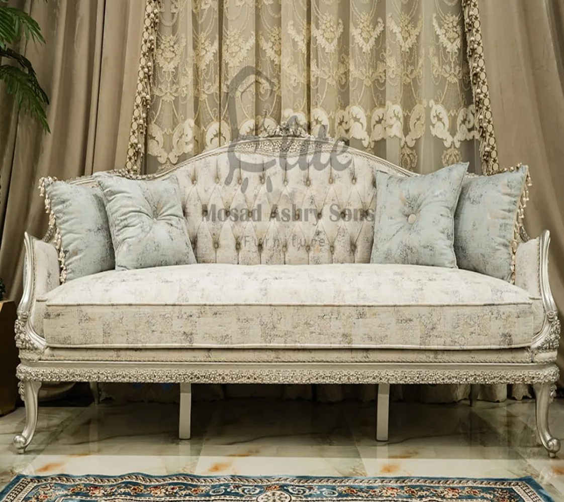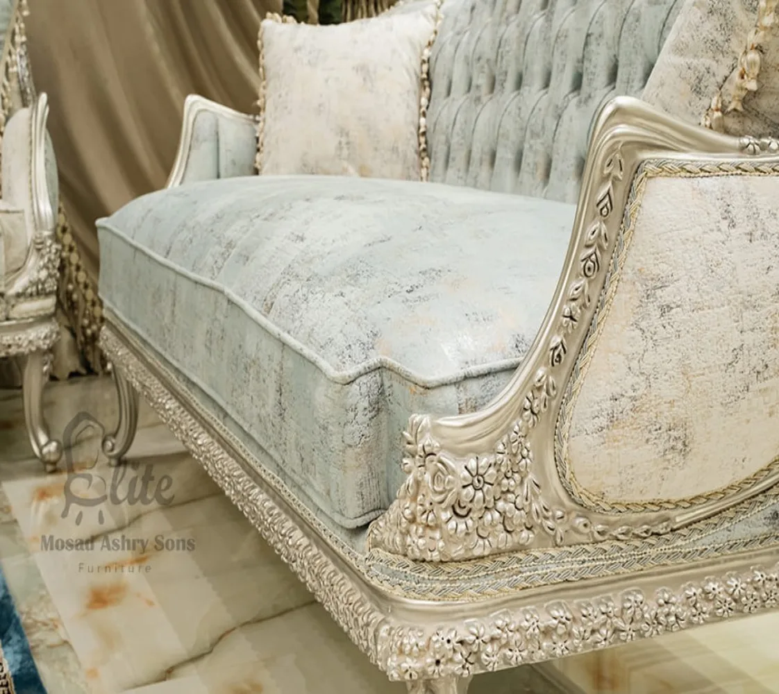 صالون نيو كلاسيك صالون مكون من كنبه كبيرة 3 مقعد وكنبه كبيرة مع 2 فوتيه وترابيزة من الرخام صالون مصنوع من الخشب الطبيعى بطابع كلاسيكى