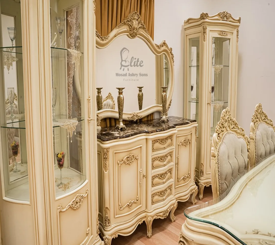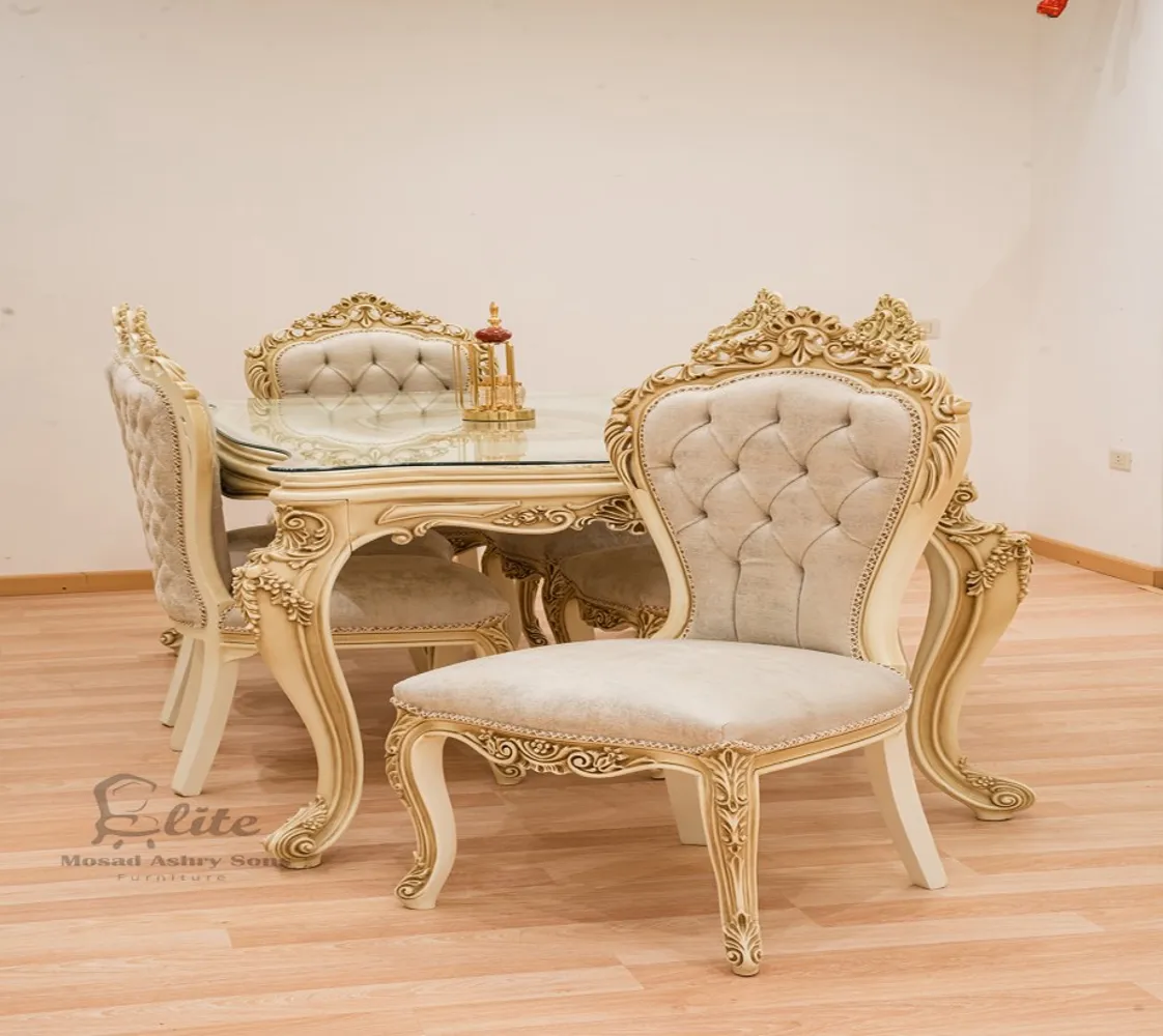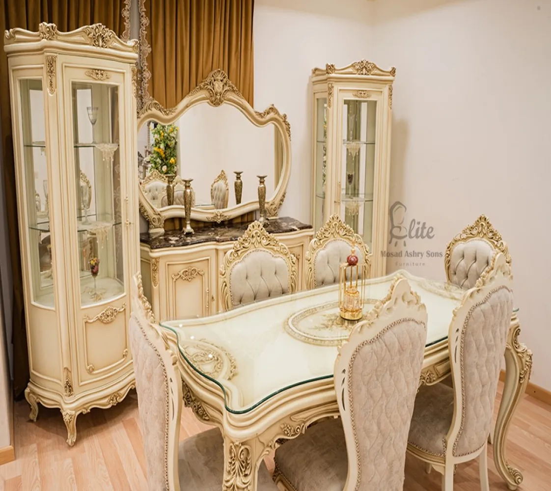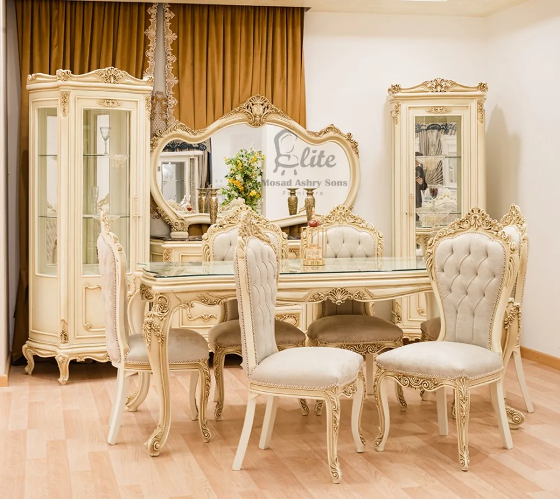 غرفة طعام كلاسيك غرفة مكونة من ترابيزة مع 6 كراسى بوفيه وبرواز مرآه مع 2 وحدة عرض خشبية غرفة مصنعة من الخشب الطبيعى بطابع كلاسيكى