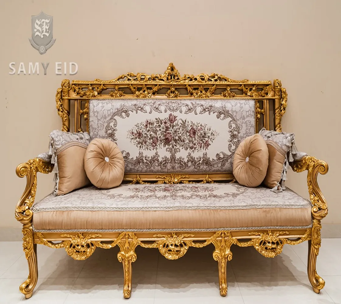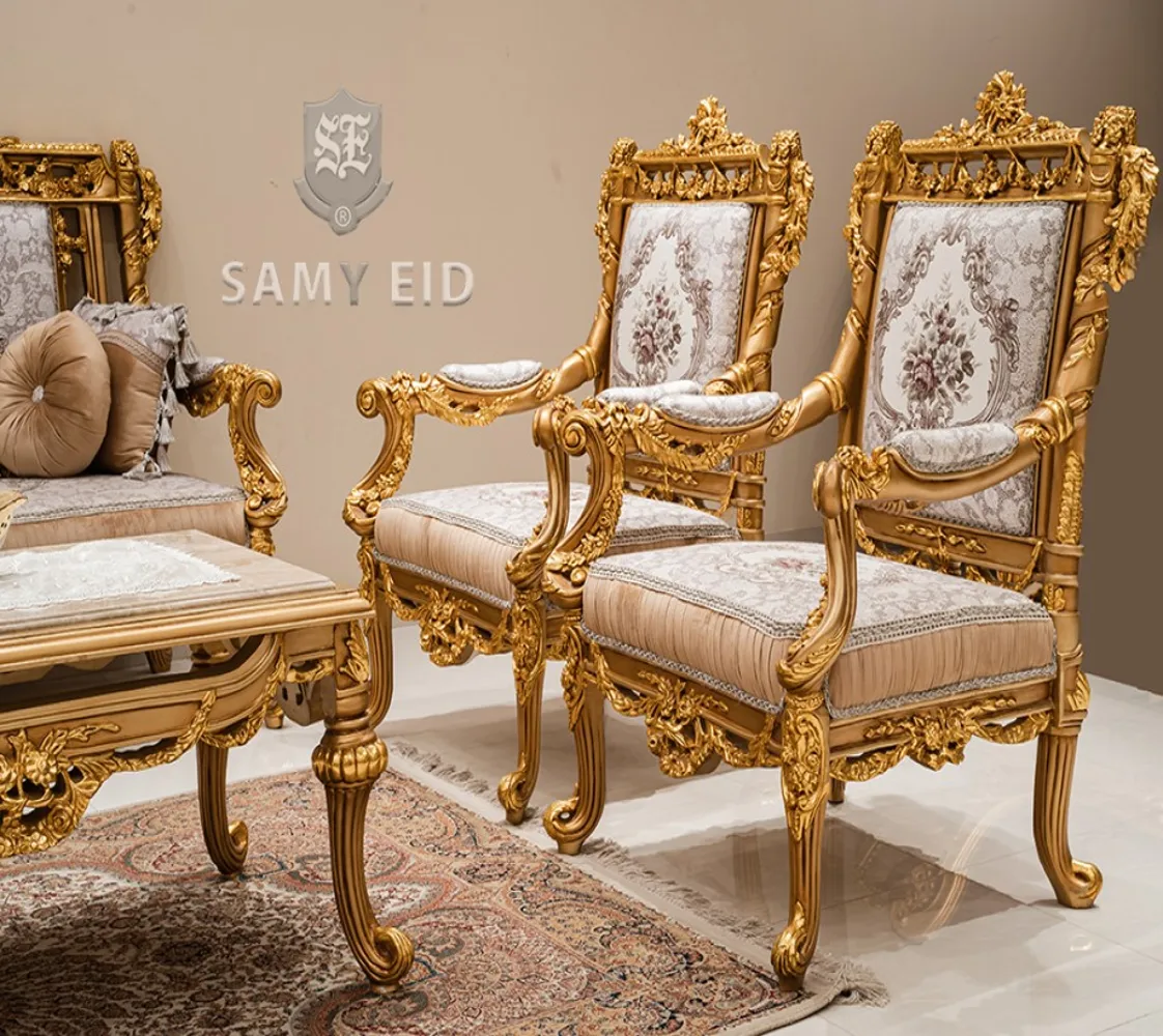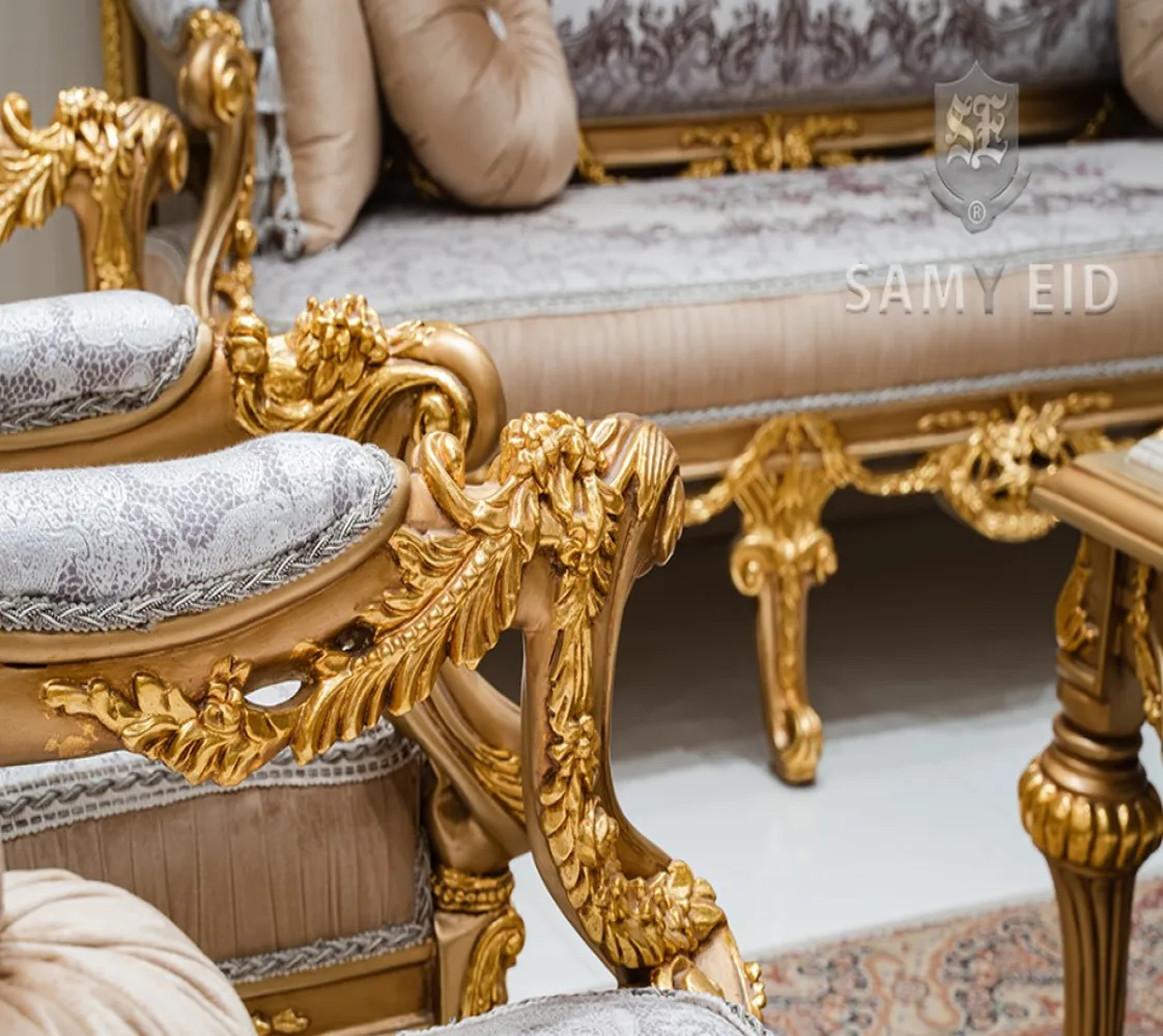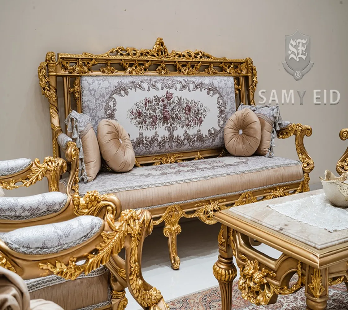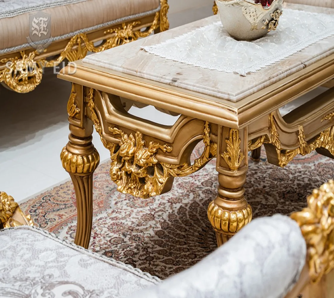 صالون مكون من كنبه كبيرة 3 مقعد مع 4 فوتيه وترابيزة من الرخام صالون مصنوع من الخشب الطبيعى بطراز كلاسيكى